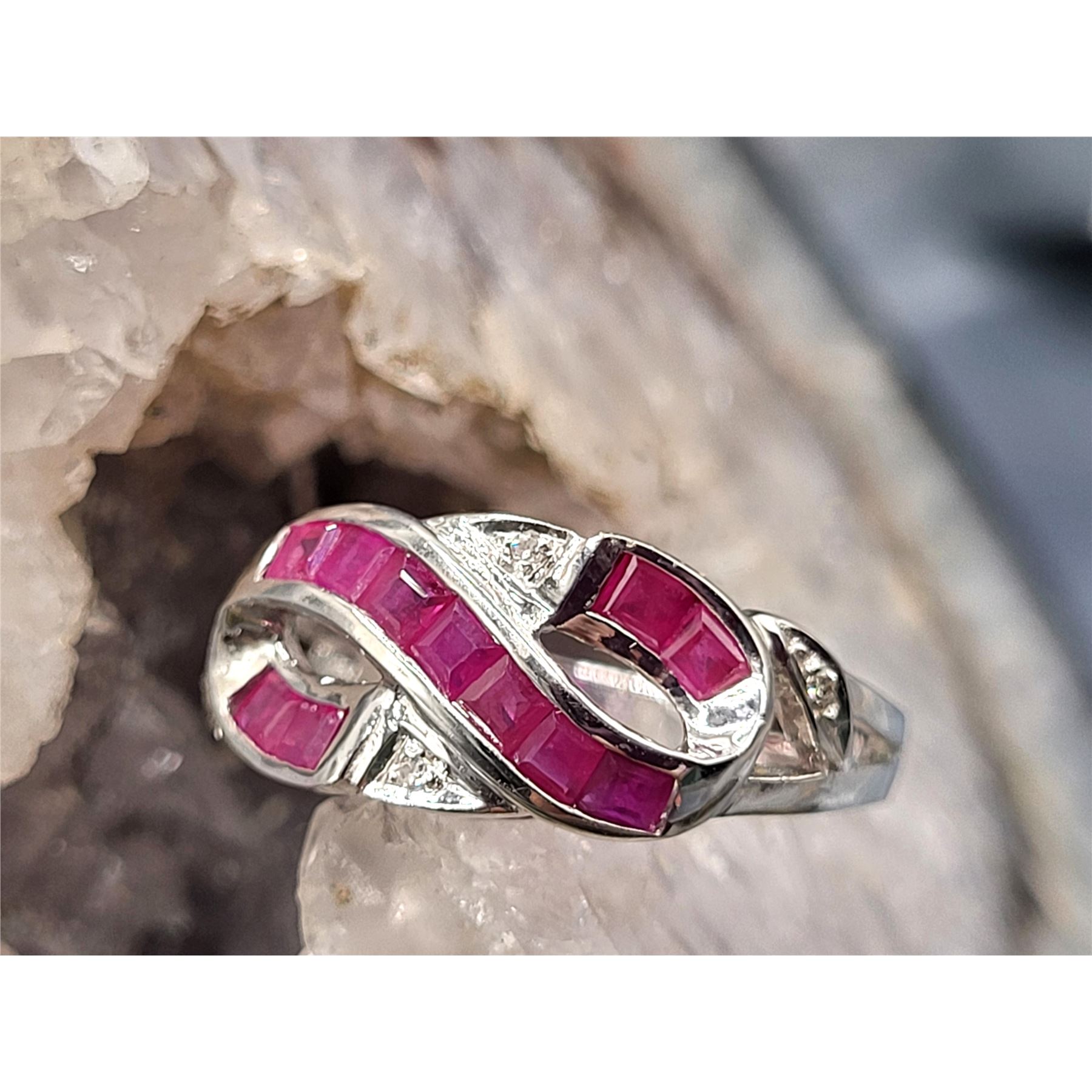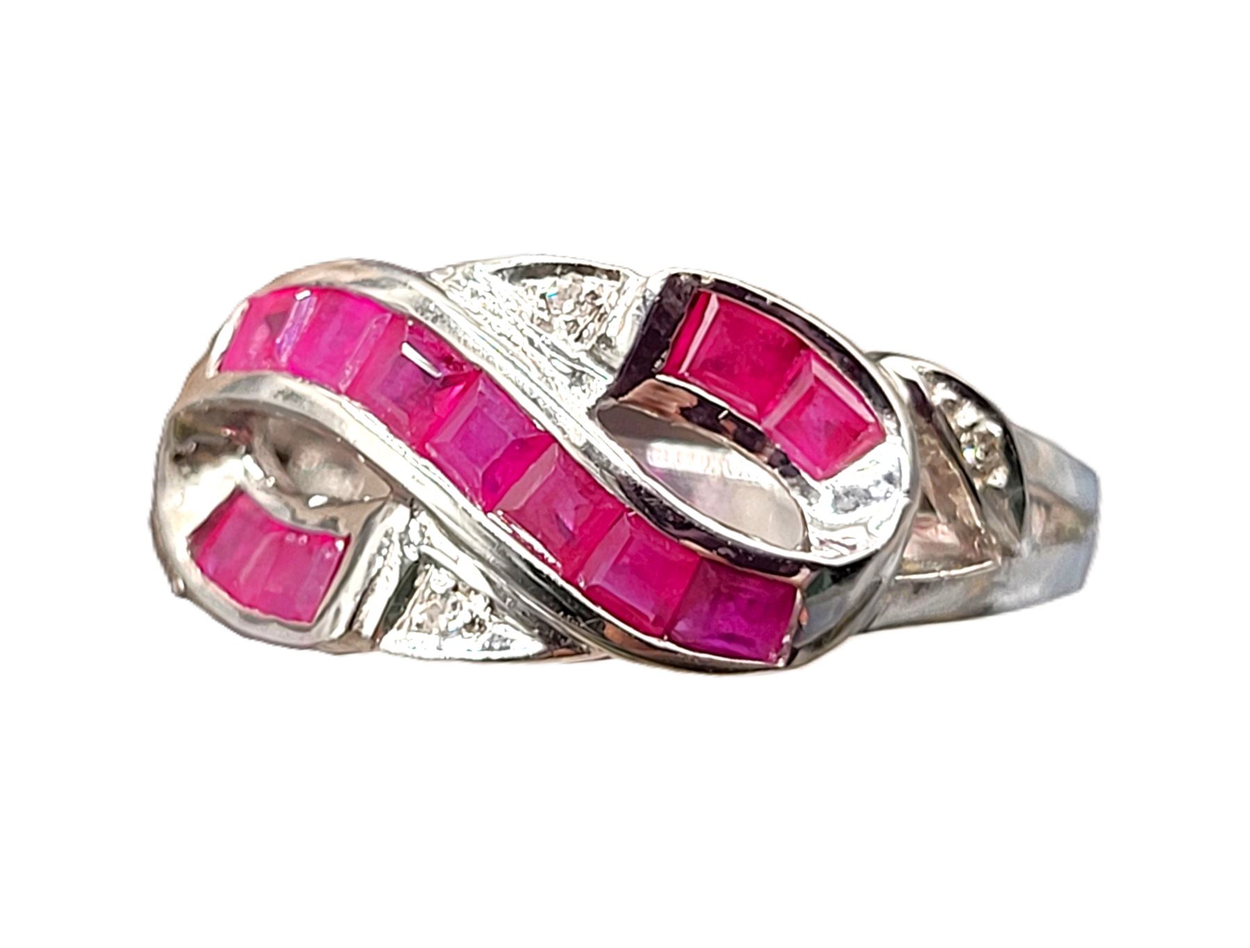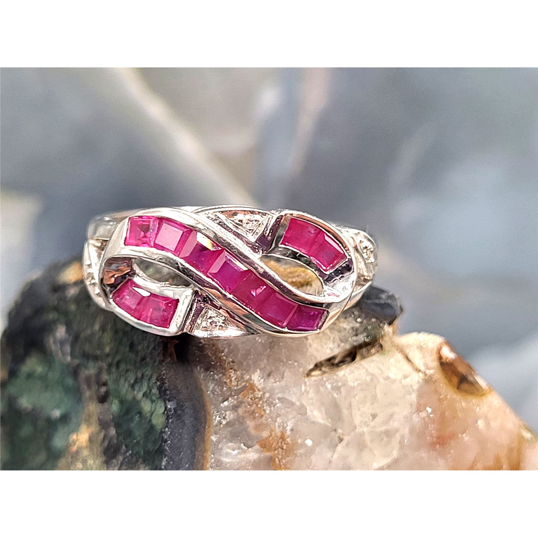 This 14 karat white gold ring features approximately 1.00 carats total weight of square-cut, channel- and invisible-set, genuine rubies with a ribbon-like flow in an infinity symbol pattern.& nbsp; There are four round, faceted accent diamonds for additional sparkle.& nbsp; This ring is US size 7 and can be sized for an additional charge. Please contact Bidfair Fine Jewelry for sizing details.