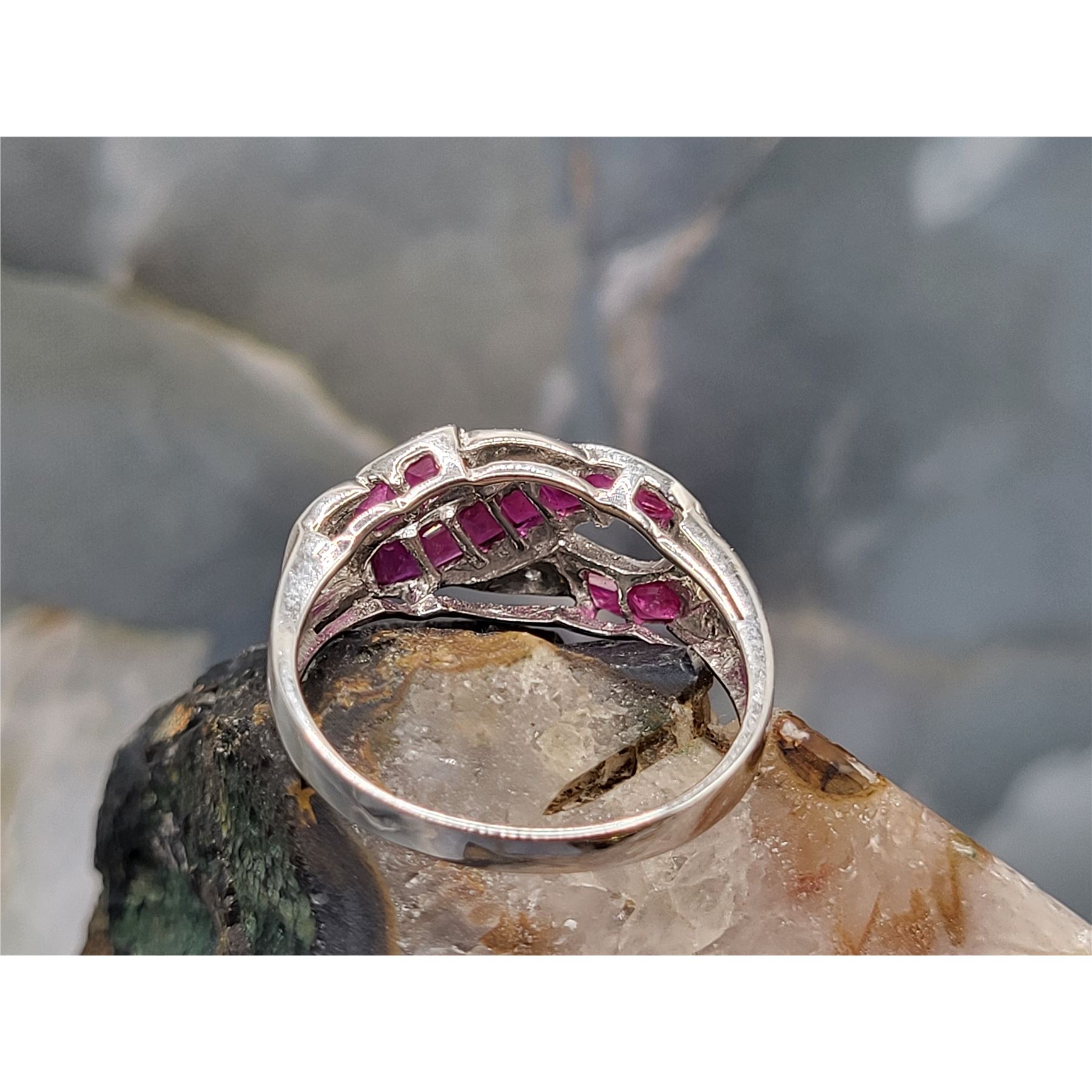 This 14 karat white gold ring features approximately 1.00 carats total weight of square-cut, channel- and invisible-set, genuine rubies with a ribbon-like flow in an infinity symbol pattern. There are four round, faceted accent diamonds for additional sparkle. This ring is US size 7. See sizing options and other information below. Please contact Bidfair Fine Jewelry for sizing details.