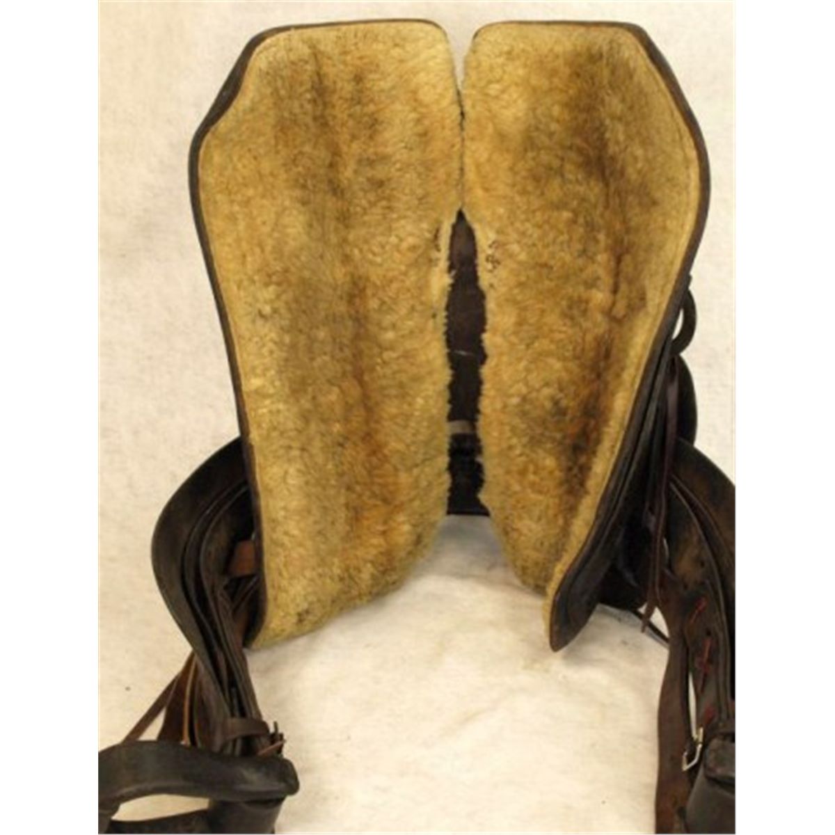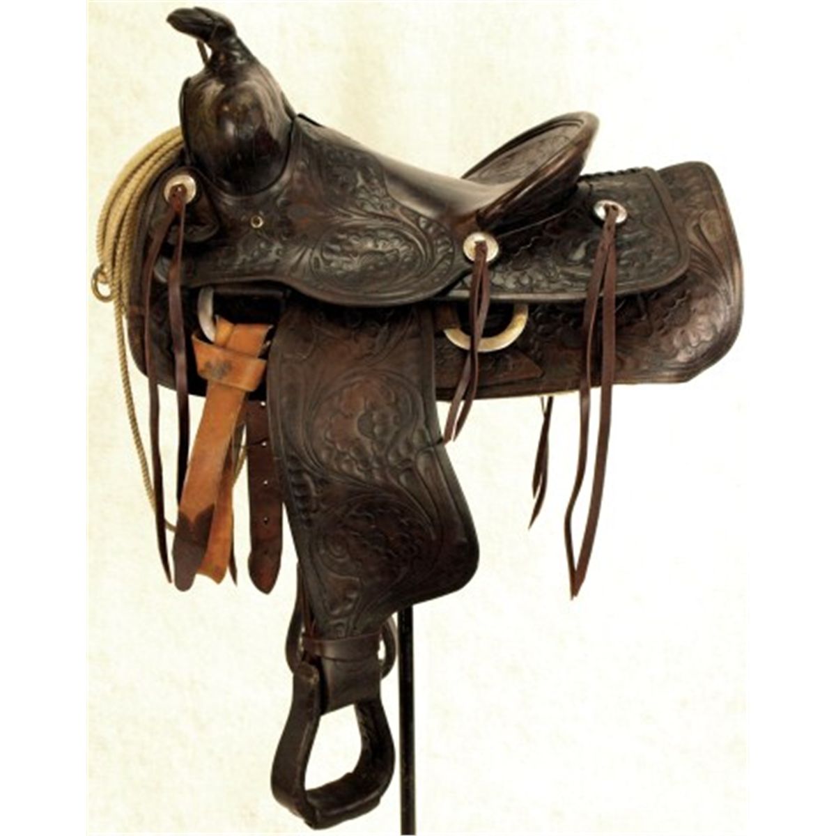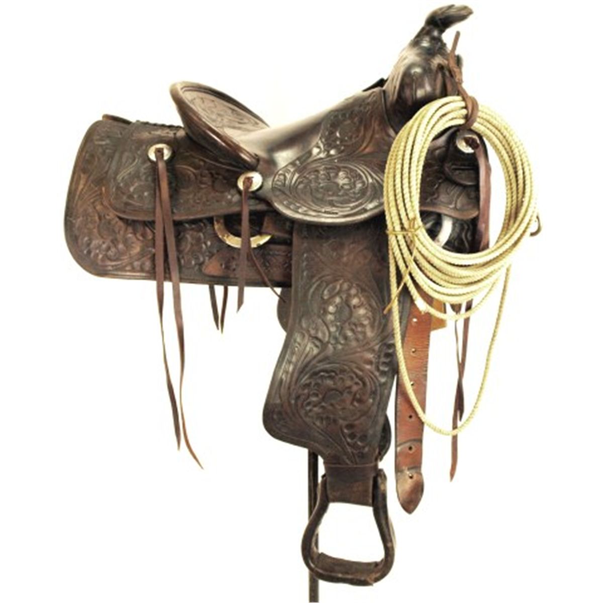 Square skirt saddle stamped Apache Saddles Amarillo TX floral carved with replaced strings, good lining, seat 14 1/2" and includes good lariat.