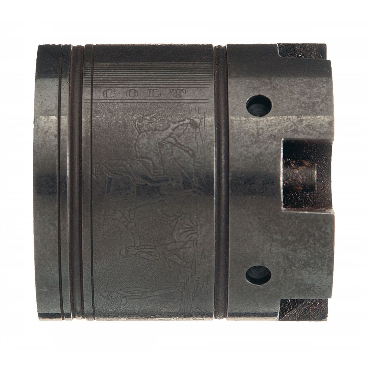 This is a 5-shot, 1 1/2 inch diameter, 1 1/2 inch long cylinder for a Colt Paterson Revolver. Blue finished, with square shoulders at the front and rear, and the Centaur scene in a 3/4 inch band around the circumference. The rear face is numbered "694". This is either the best reproduction writer has viewed or purely a refinished original. Nonetheless, it will fill the void in your Paterson case just fine! You be the judge!