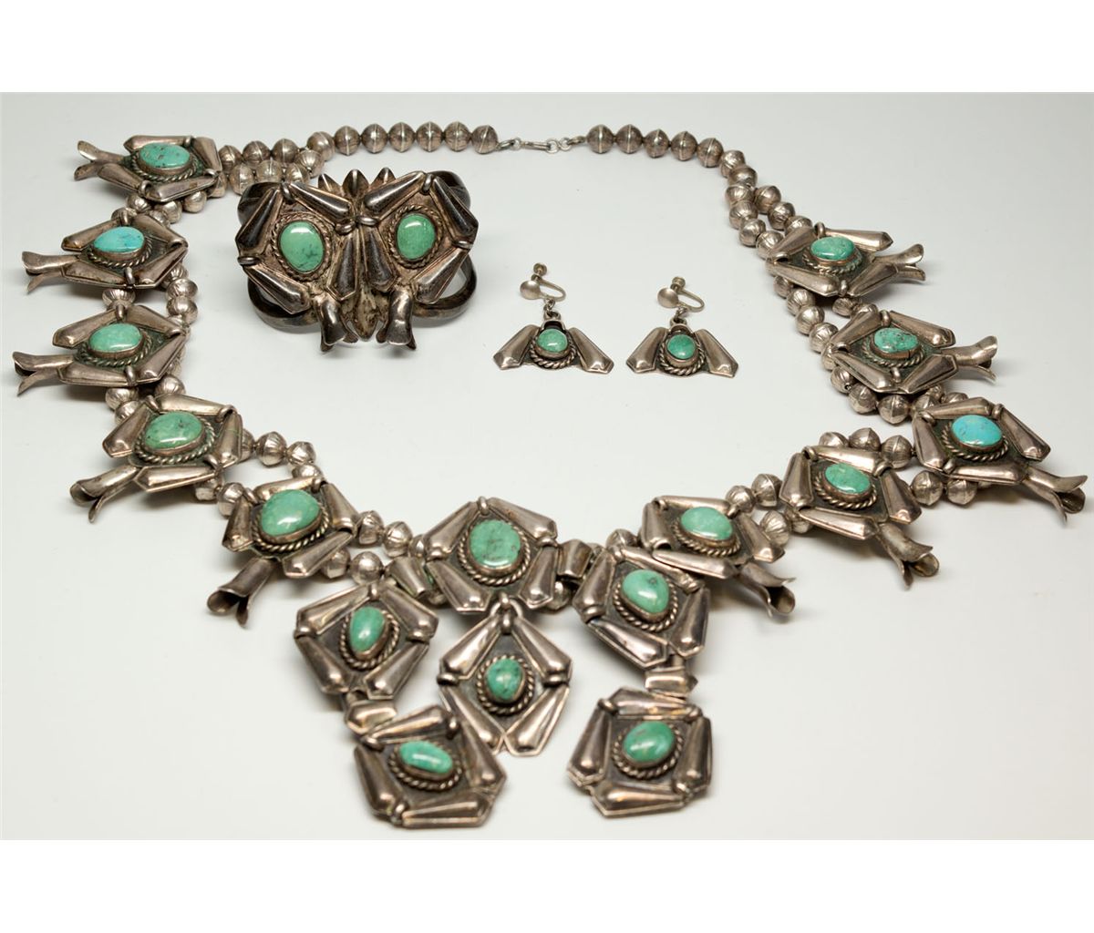 c1950s-1970s - This vintage set consists of a massive squash blossom necklace with matching bracelet and screw back earrings in a most unusual design. The necklace measures 28” in total length (18” hanging length), the naja is 4.5" wide x 4” length and has a central pendant suspended from the center. Each green cabochon is mounted in the center of four silver side pieces with a 5th “pomegranate” silver flute extending from the bottom. There are five of these on each side of the necklace, and the naja contains six. One of the stones on the right side, and two on the left side of the necklace are not the same green turquoise color; rather, they are closer to a bright blue color. The double strands of silver beads are bench made and fluted. The necklace is strung on a utilitarian stainless steel chain, but may have been restrung from its original rope or wire. Completing the set are the bracelet and earrings, both consisting of the same design element and green stones as the necklace. The bracelet’s pieces are mounted on a sand cast base. There is no discernible maker’s mark. We are presuming this set to be Navajo made. Zuni, Hopi and Pueblo people are all known to make squash blossoms. Heavy and impressive.