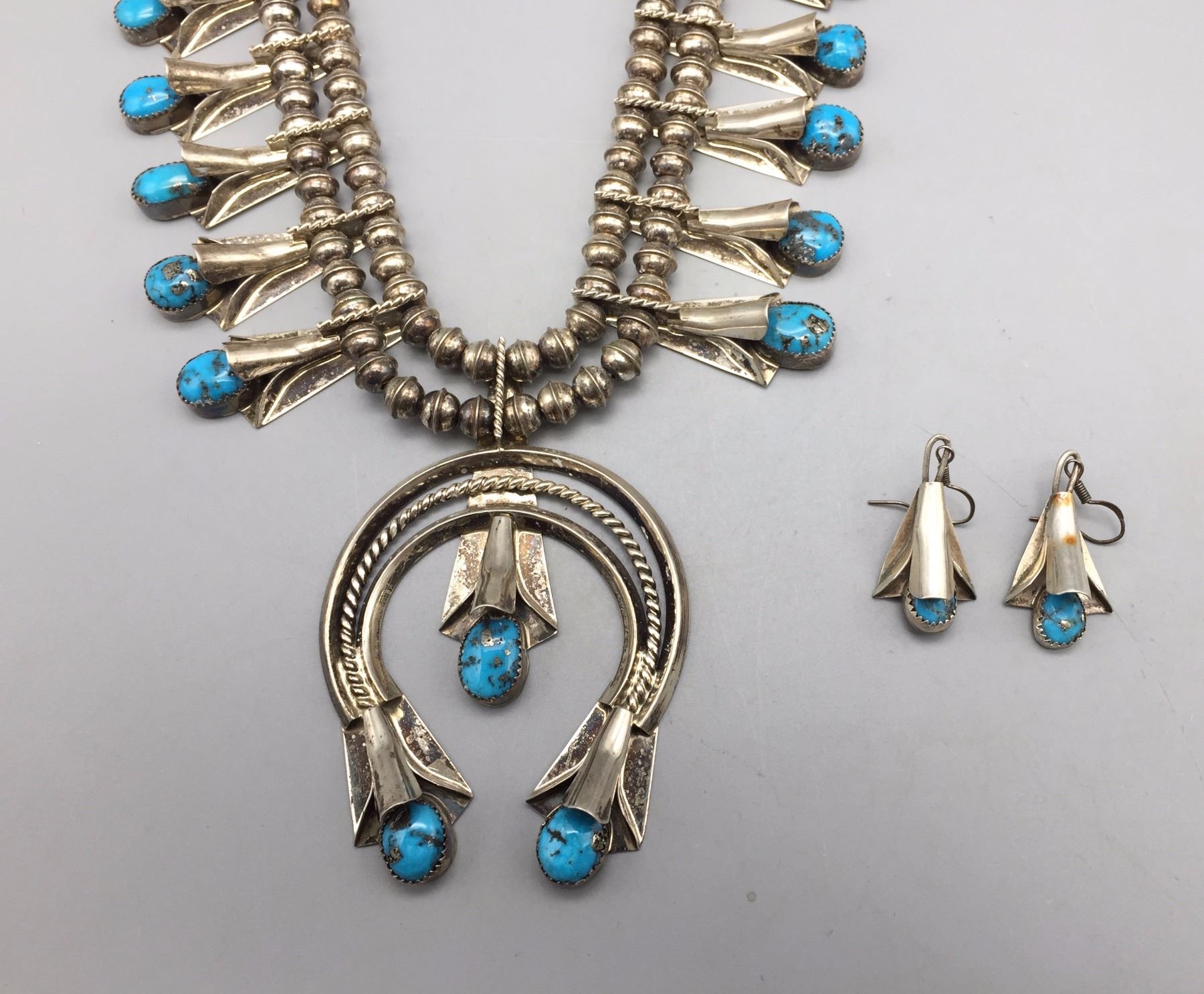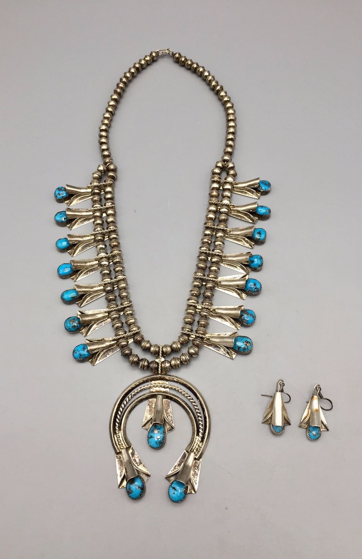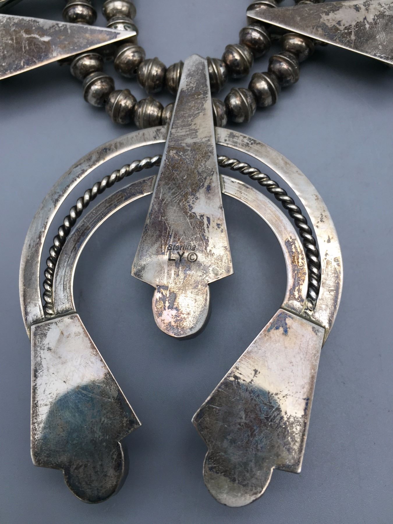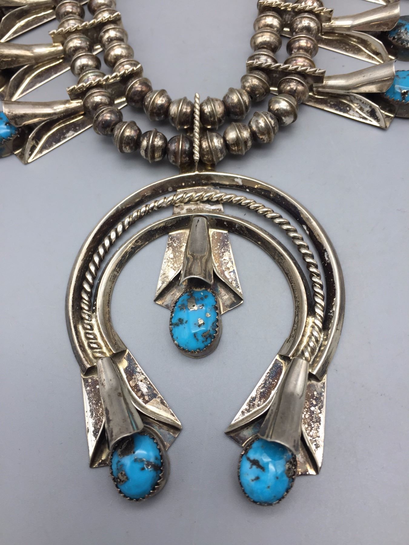 Maker: Hallmarked LY, unknown, could be one of a few makers. Approx. Age: Fairly modern. Size: Measures approx. 22” around the neck. Earrings are 1 3/4” long. Weighs 142 g. Additional Info: This necklace is featured on an episode of Western Trading Post TV! It's a unique turquoise and sterling silver squash blossom necklace and matching earring set. Condition: Good, normal wear expected. Please look closely at the pictures - they are an important part of our description. Shipping: There will be a $5 handling / packaging fee for shipping this lot. The actual cost of postage will be added on top of that.