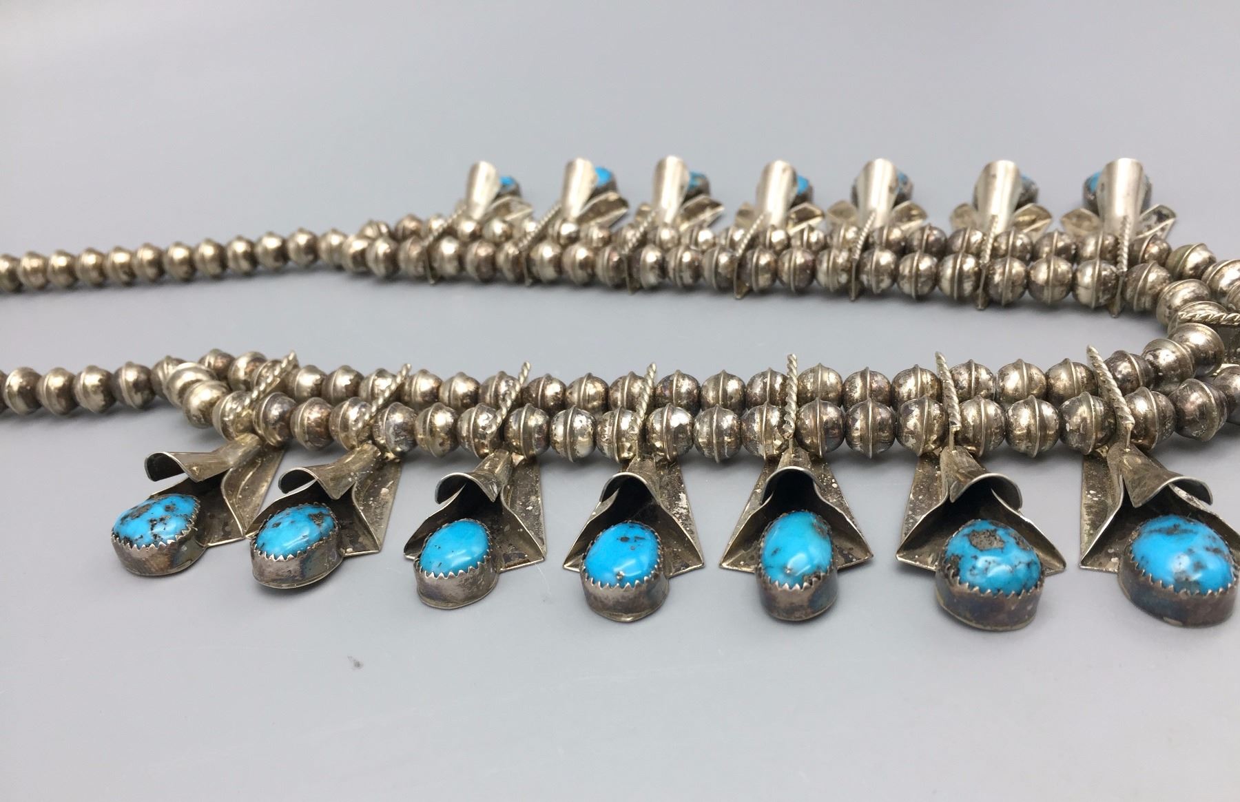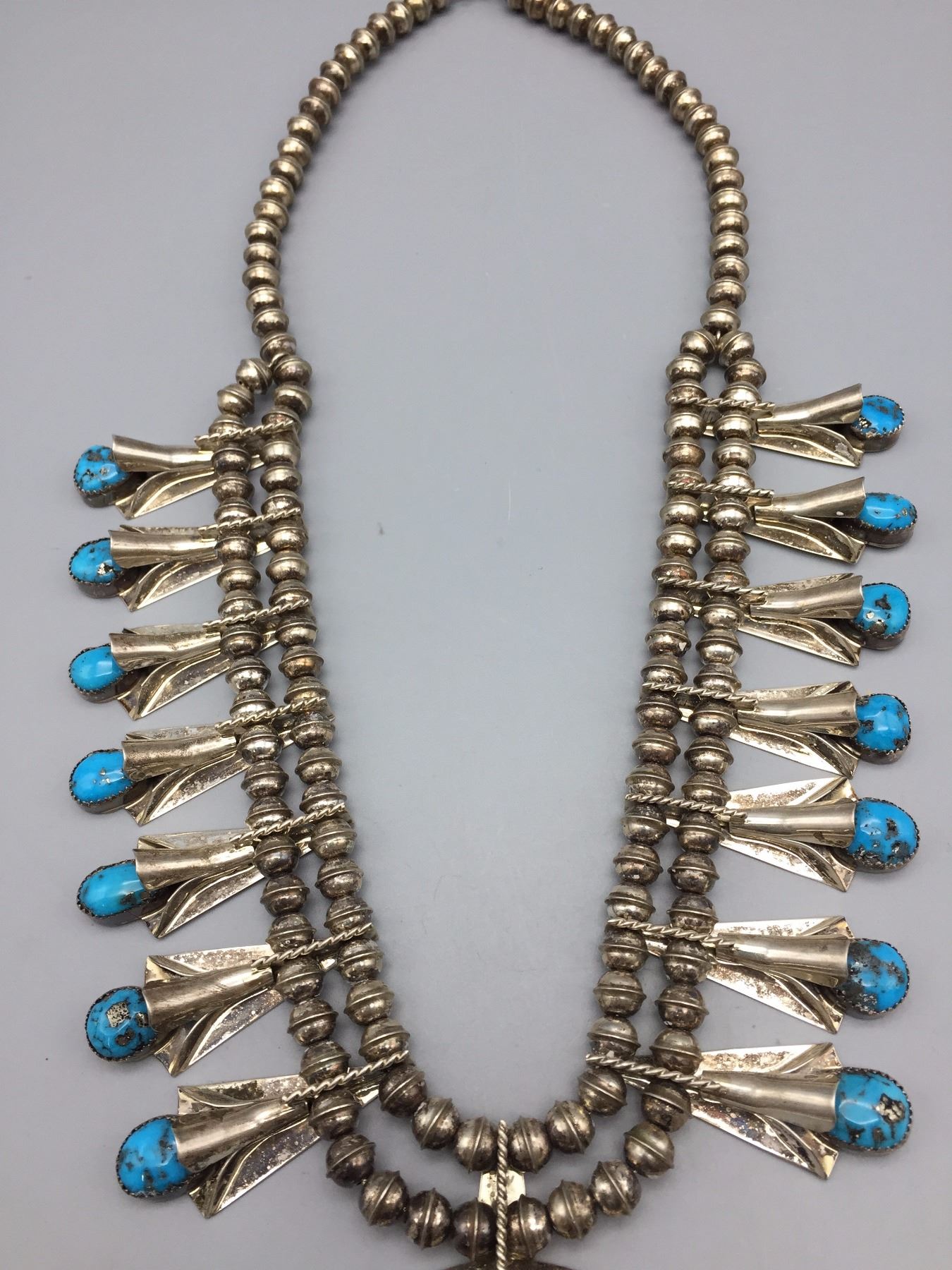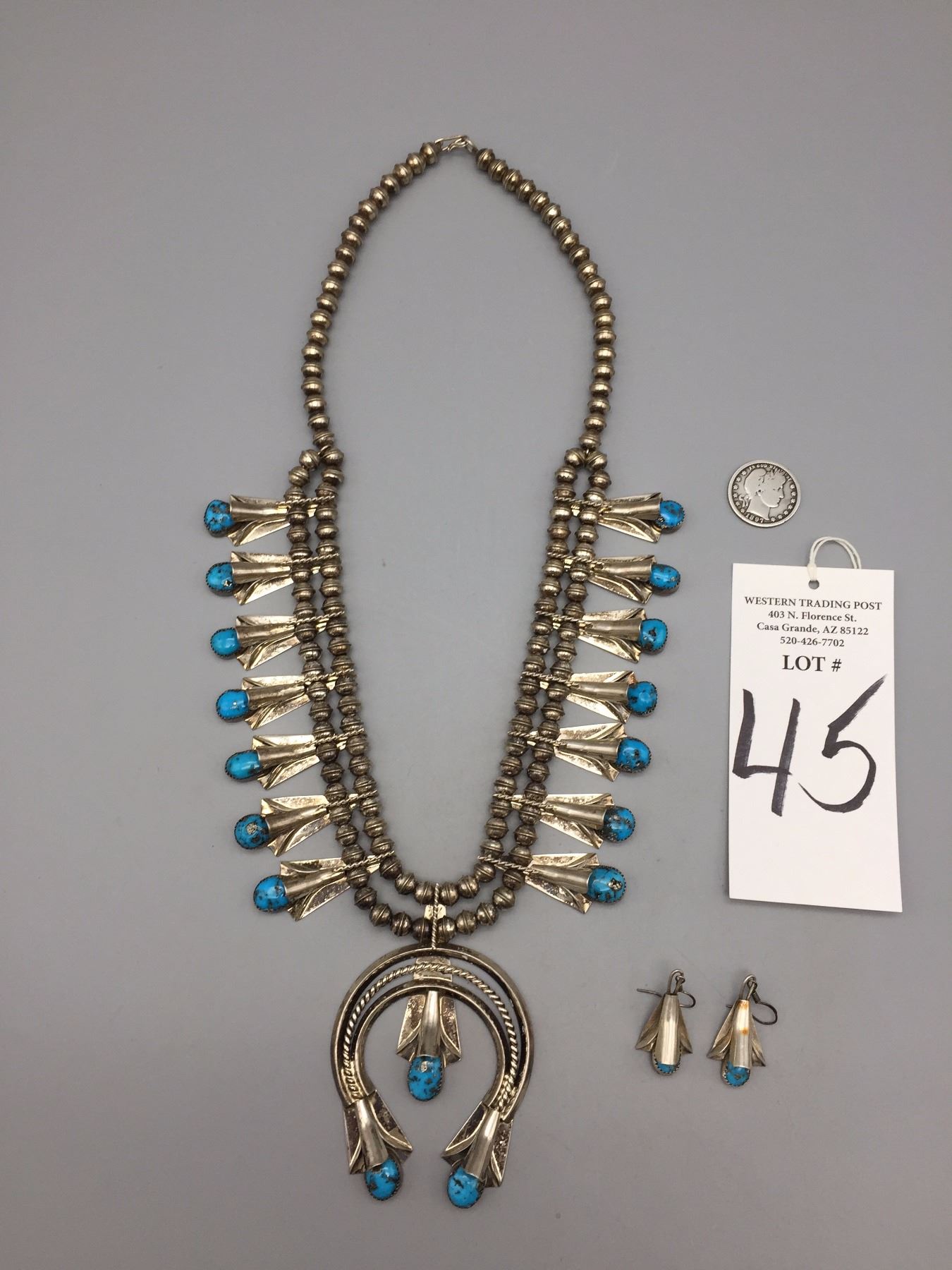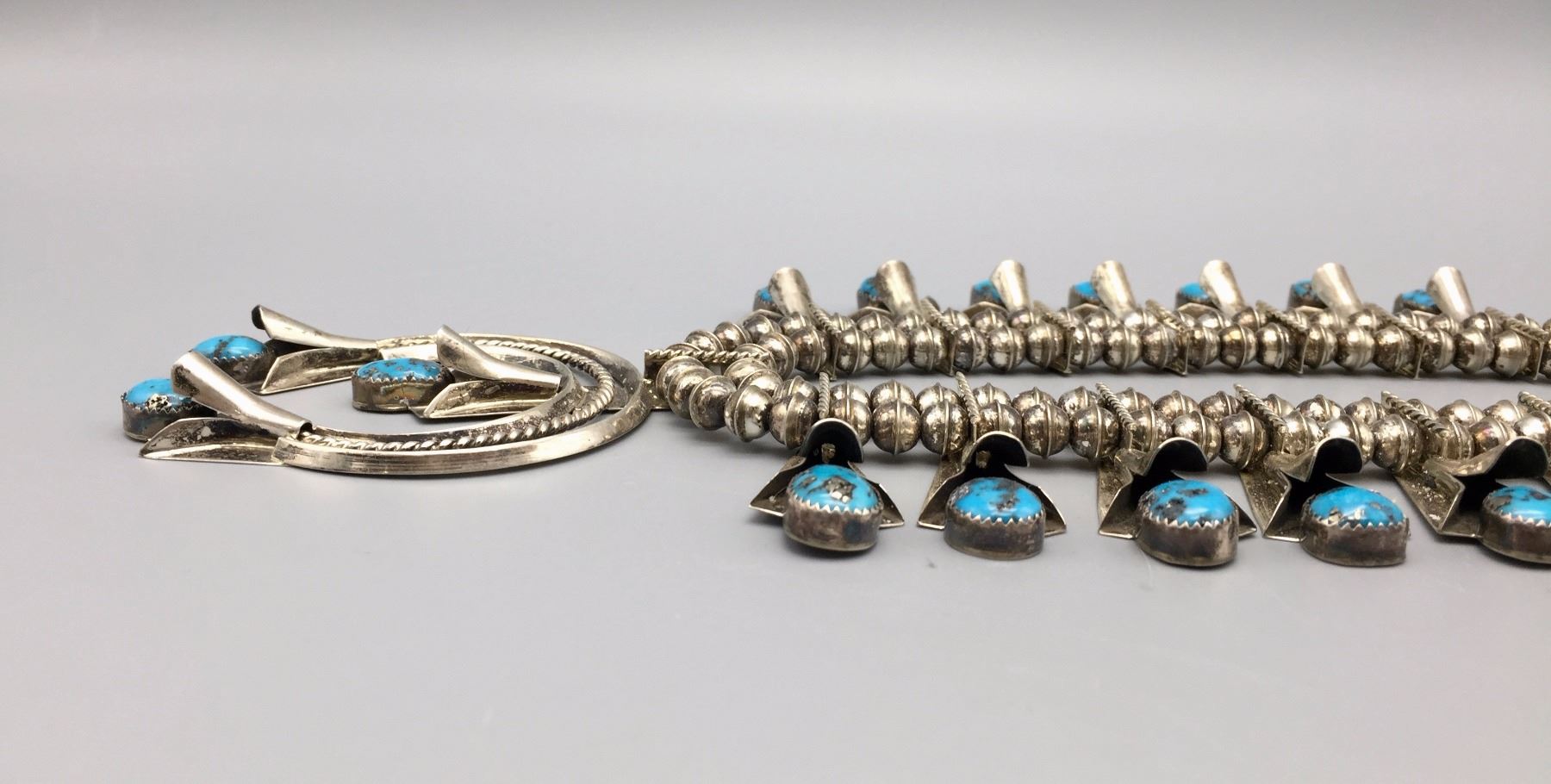 Maker: Hallmarked LY, unknown, could be one of a few makers. Approx. Age: Fairly modern. Size: Measures approx. 22” around the neck. Earrings are 1 3/4” long. Weighs 142 g. Additional Info: This necklace is featured on an episode of Western Trading Post TV! It's a unique turquoise and sterling silver squash blossom necklace and matching earring set. Condition: Good, normal wear expected. Please look closely at the pictures - they are an important part of our description. Shipping: There will be a $5 handling / packaging fee for shipping this lot. The actual cost of postage will be added on top of that.