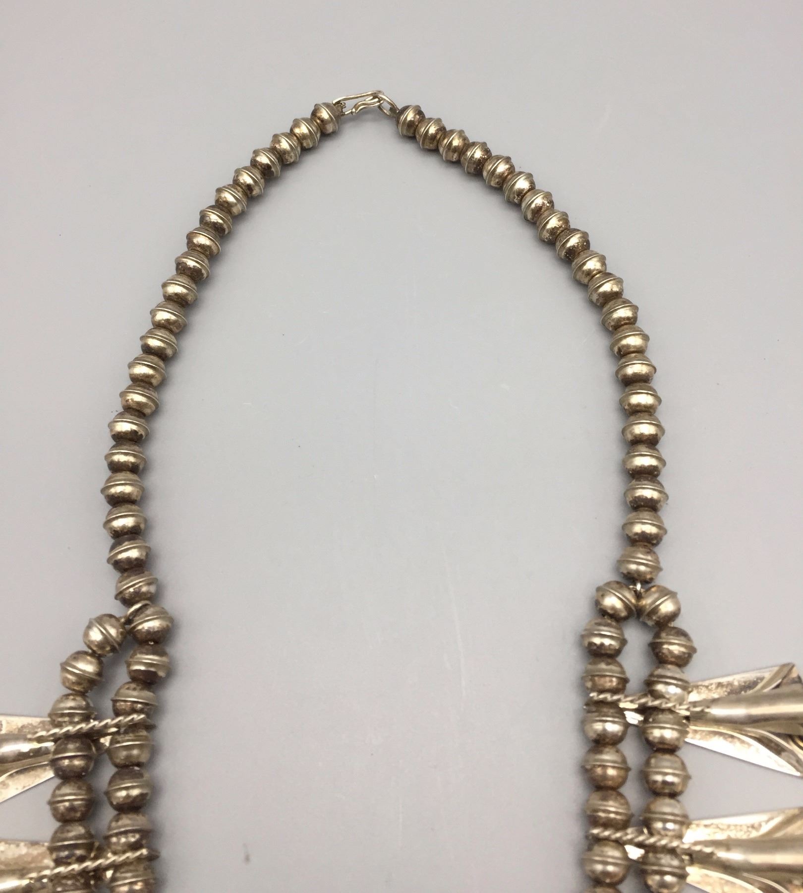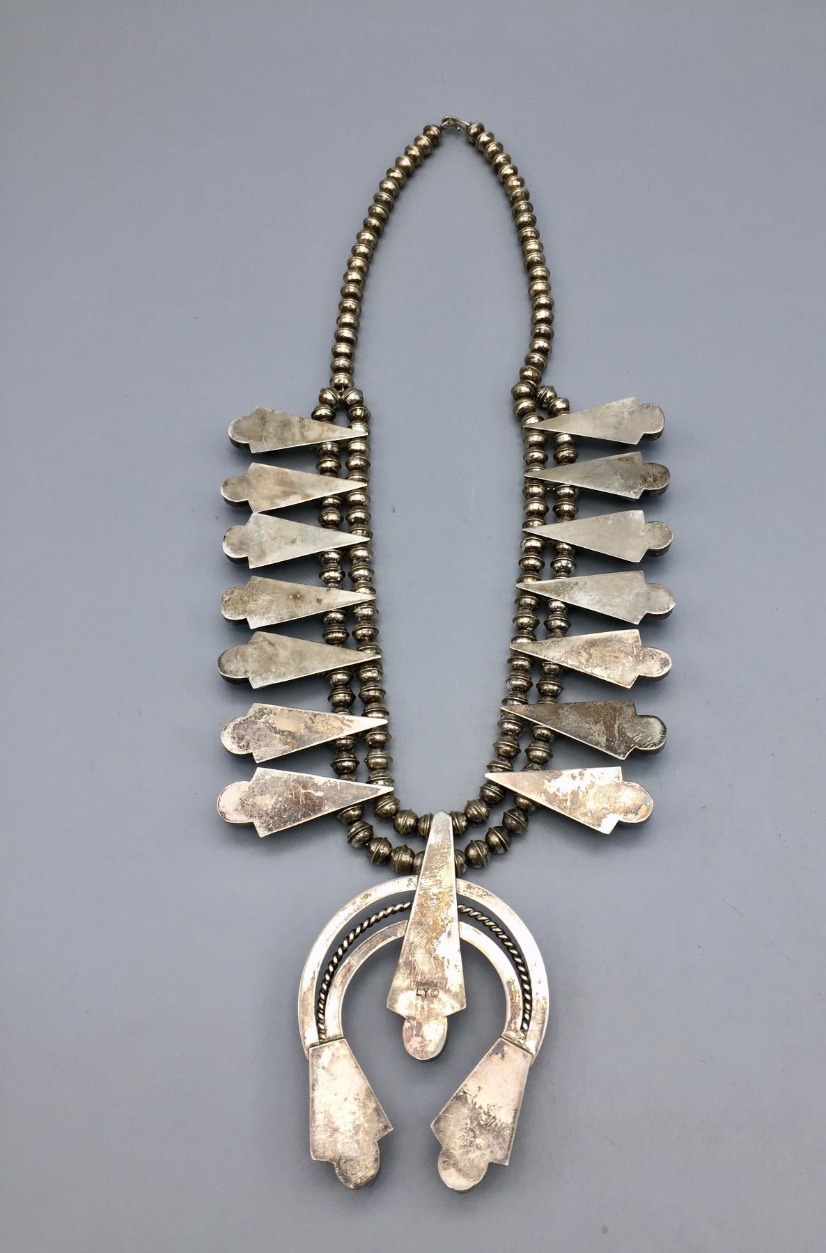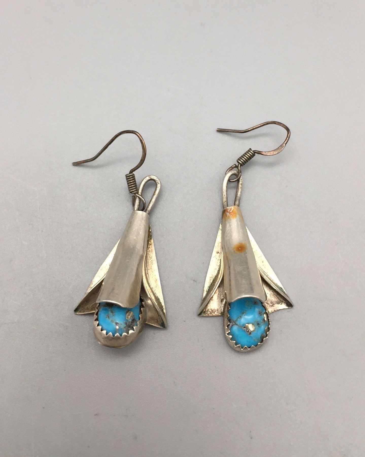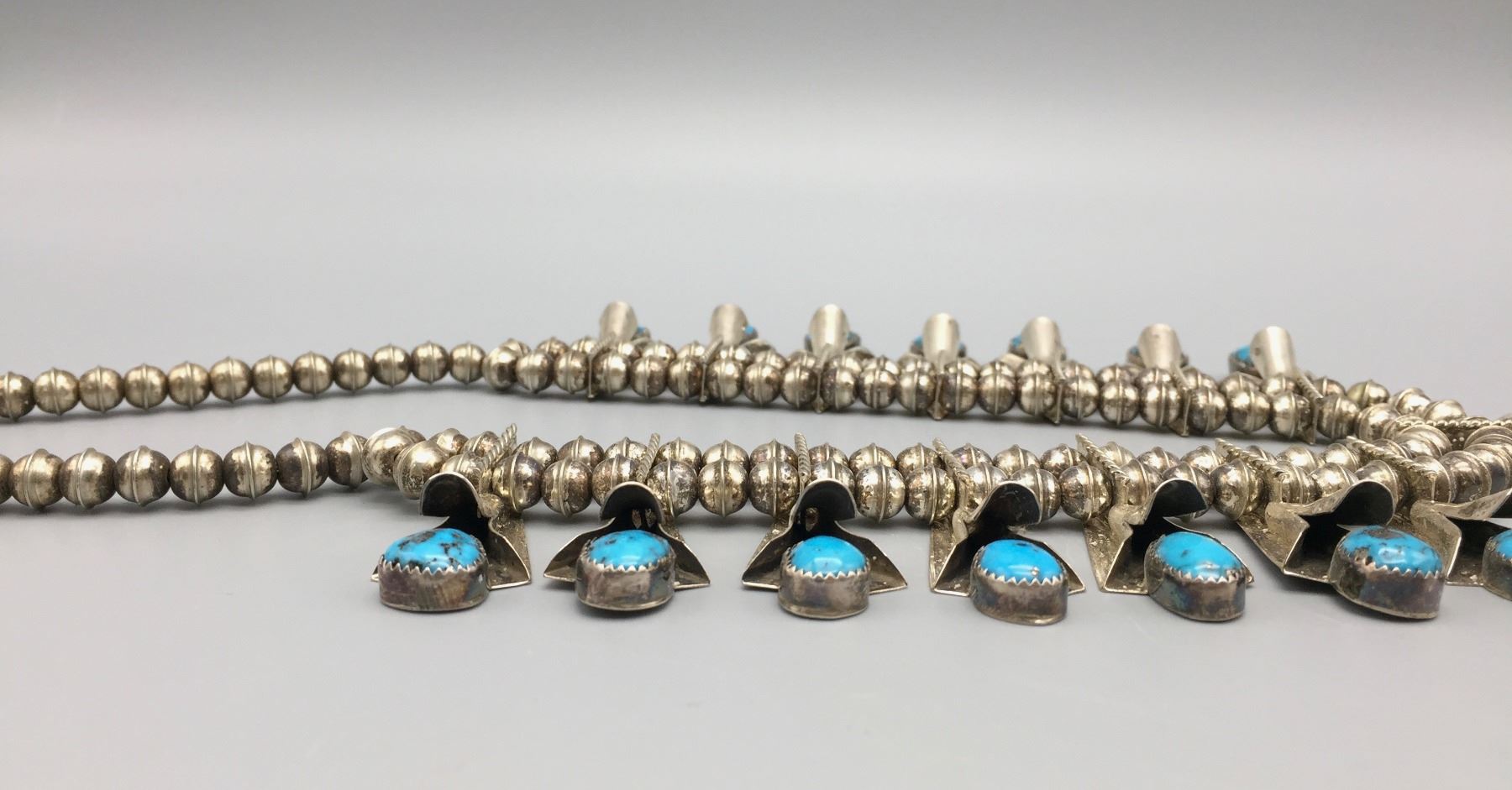 Maker: Hallmarked LY, unknown, could be one of a few makers. Approx. Age: Fairly modern. Size: Measures approx. 22” around the neck. Earrings are 1 3/4” long. Weighs 142 g. Additional Info: This necklace is featured on an episode of Western Trading Post TV! It's a unique turquoise and sterling silver squash blossom necklace and matching earring set. Condition: Good, normal wear expected. Please look closely at the pictures - they are an important part of our description. Shipping: There will be a $5 handling / packaging fee for shipping this lot. The actual cost of postage will be added on top of that.