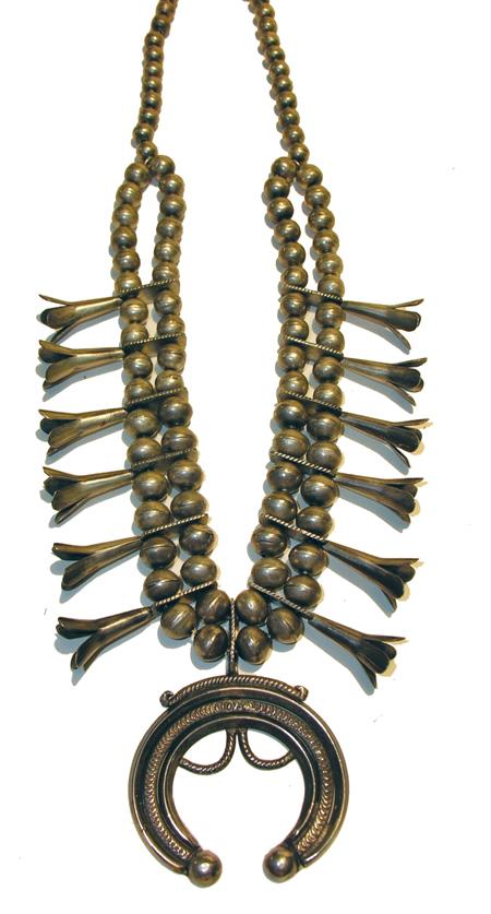 Circa 1940, Classic all-sterling squash blossom necklace with double row of hand made beads. File work on naja and blossoms. 24" long, 3-1/4" naja