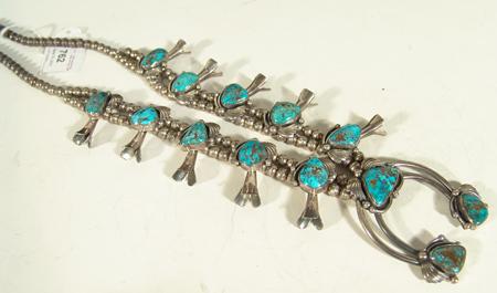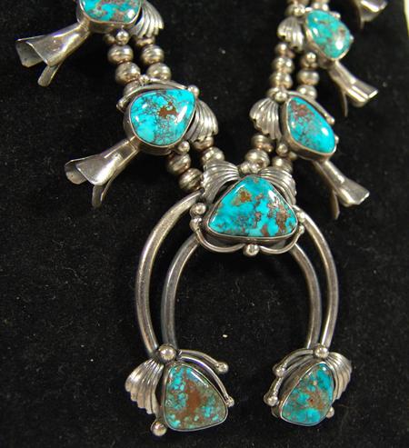Necklace with exquisite leaf work, all natural Nevada turquoise stones, and hand wrought beads. 28"