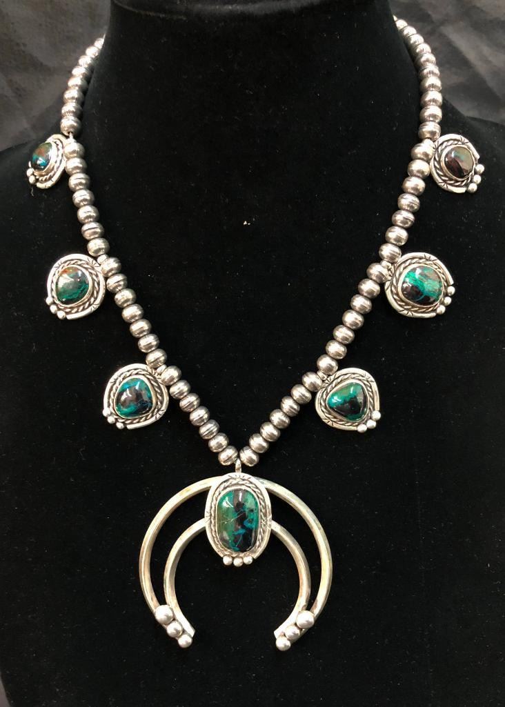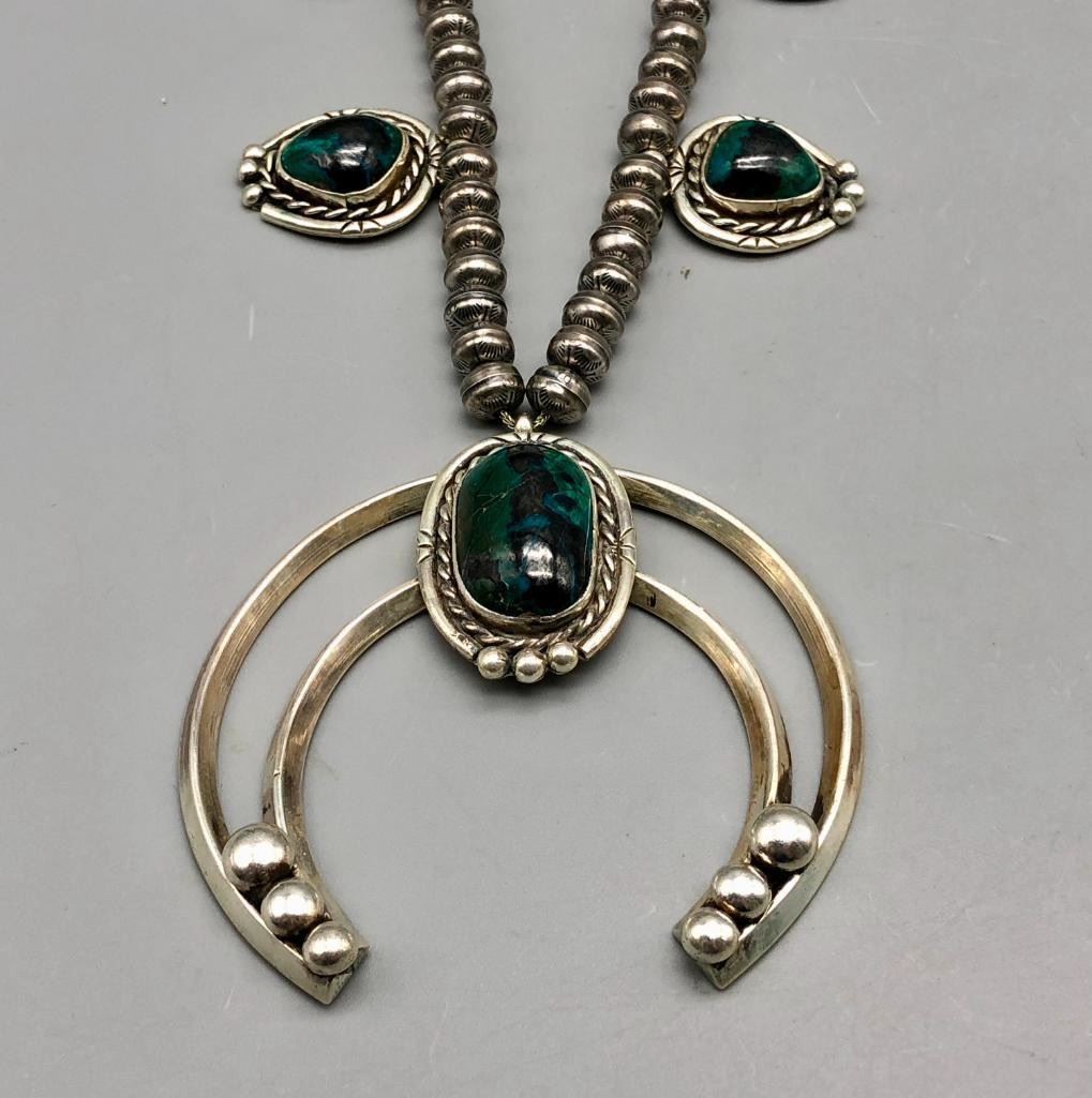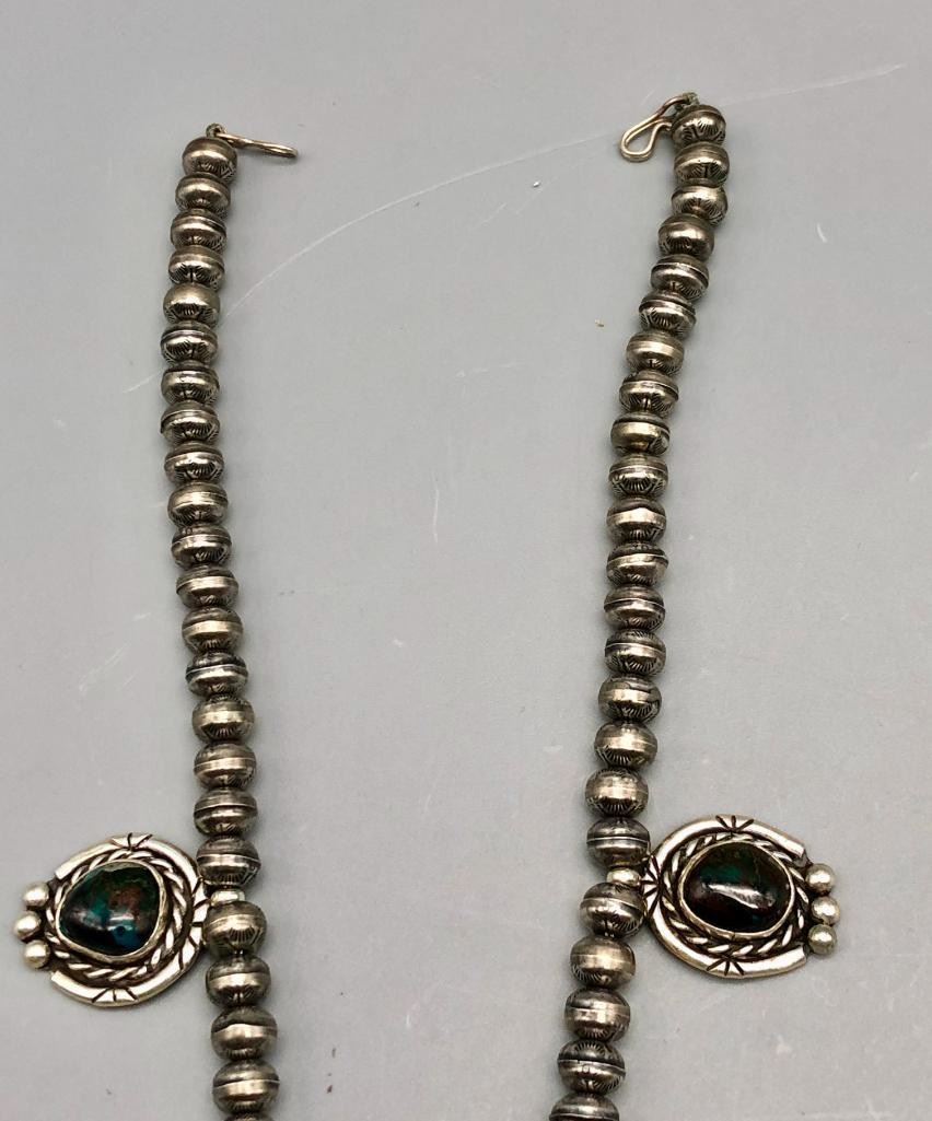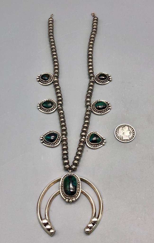For sale in this lot is a squash blossom style necklace. This is a great necklace set with chrysocolla cabochons which have a gorgeous color to them. It has hand stamped beads that are strung on a foxtail chain and is made from sterling silver. MAKER: Unmarked. APPROX AGE: Circa 1970s-1980s. SIZE: Measures 19 inches long end to end. Pendant measures 3 inches long X 2-5/8 inches wide. Weighs 93.6 grams. CONDITION: Good for its age, normal wear expected. Please look closely at the pictures as they are an important part of our description and are hereby incorporated into the description, specifically with regards to condition. SHIPPING: There will be a $5 handling / packaging fee for shipping this lot. The actual cost of postage will be added on top of that. BUY IT NOW: If you would like to buy this item now, without waiting for the auction day to bid on it, we do offer this option (which is available up to 48 hours before the actual auction starts). The “Buy it Now” price is the high estimate of this lot (plus applicable fees and the Buyer's premium is discounted to 10% when using the Buy it Now option). If you would like to exercise this option, you must contact us by email (or phone as long as you talk to someone live). Reference this lot number and your intention to "Buy it Now."
