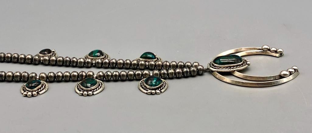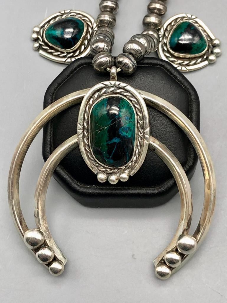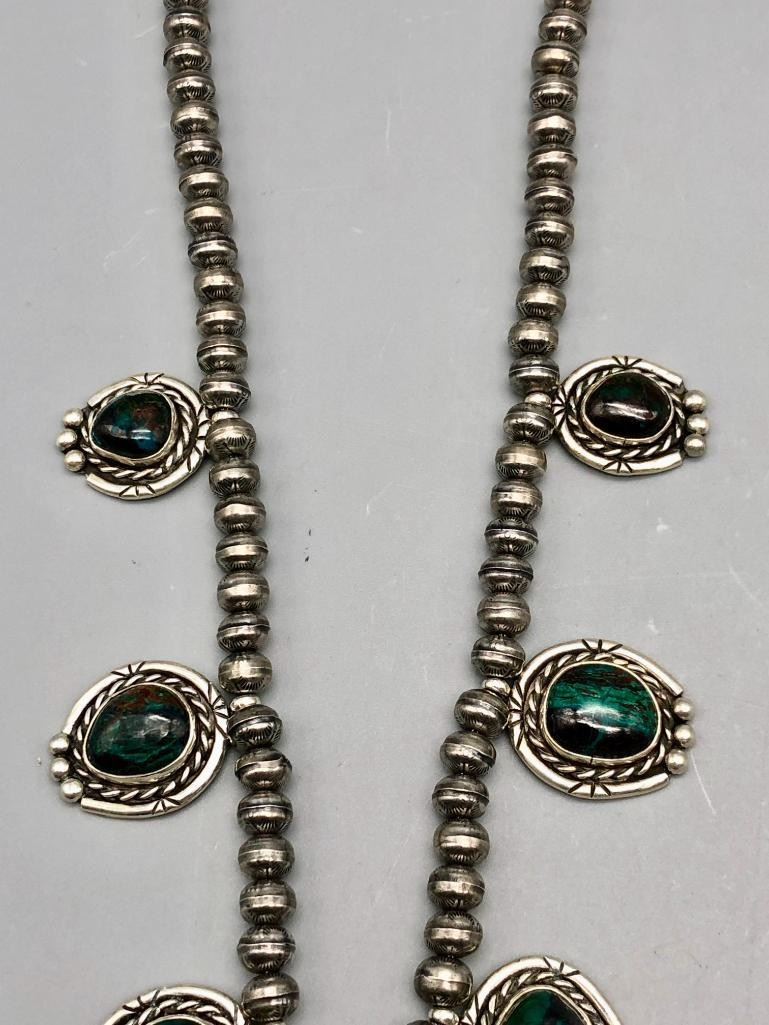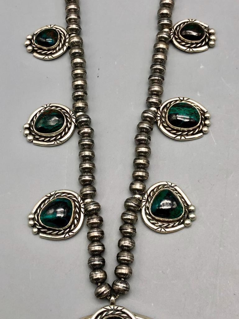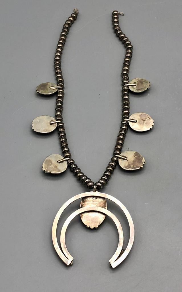 For sale in this lot is a squash blossom style necklace. This is a great necklace set with chrysocolla cabochons which have a gorgeous color to them. It has hand stamped beads that are strung on a foxtail chain and is made from sterling silver. MAKER: Unmarked. APPROX AGE: Circa 1970s-1980s. SIZE: Measures 19 inches long end to end. Pendant measures 3 inches long X 2-5/8 inches wide. Weighs 93.6 grams. CONDITION: Good for its age, normal wear expected. Please look closely at the pictures as they are an important part of our description and are hereby incorporated into the description, specifically with regards to condition. SHIPPING: There will be a $5 handling / packaging fee for shipping this lot. The actual cost of postage will be added on top of that. BUY IT NOW: If you would like to buy this item now, without waiting for the auction day to bid on it, we do offer this option (which is available up to 48 hours before the actual auction starts). The “Buy it Now” price is the high estimate of this lot (plus applicable fees and the Buyer's premium is discounted to 10% when using the Buy it Now option). If you would like to exercise this option, you must contact us by email (or phone as long as you talk to someone live). Reference this lot number and your intention to "Buy it Now."