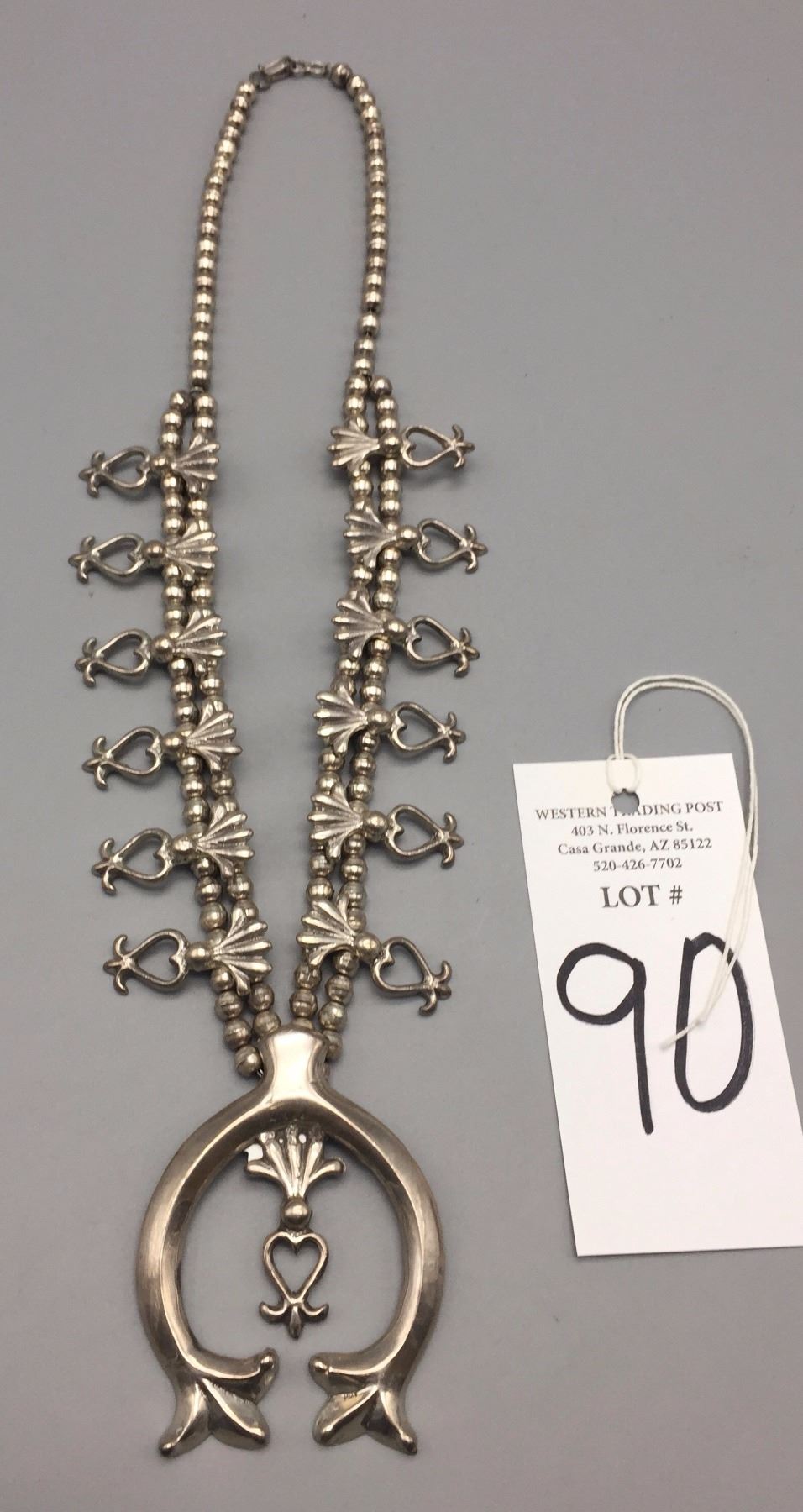 Maker: Unmarked, but Navajo style.                                                                                                                    Approx. Age: Circa 1980s.                                                                                                            Size: Fits 24” around the neck, plus the naja is another 2.5” x 3”. Weighs 169.7g.                                                                                                                        Condition: Good for its age, normal wear expected.                                                                                                          Additional Info: Sterling silver, unique style.                                                                                                        Please look closely at the pictures - they are an important part of our description.                                Shipping: There will be a $5 handling / packaging fee for shipping this lot. The actual cost of postage will be added on top of that.