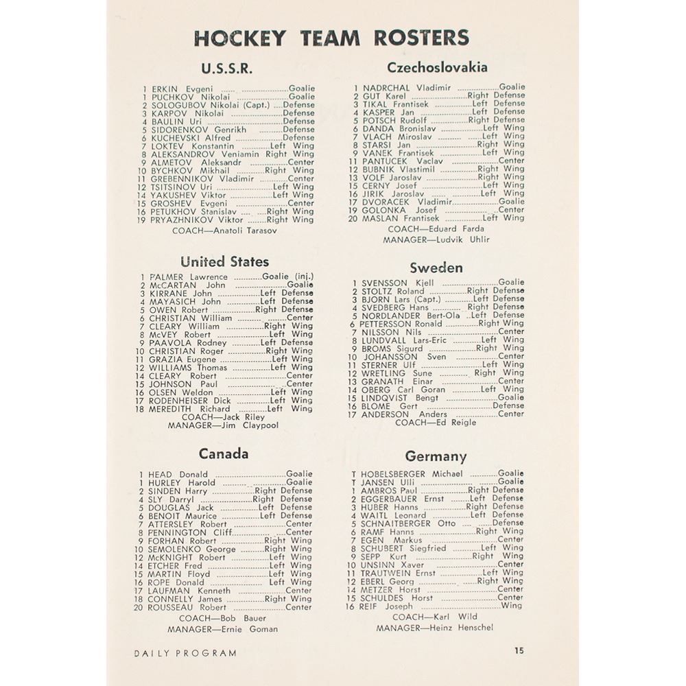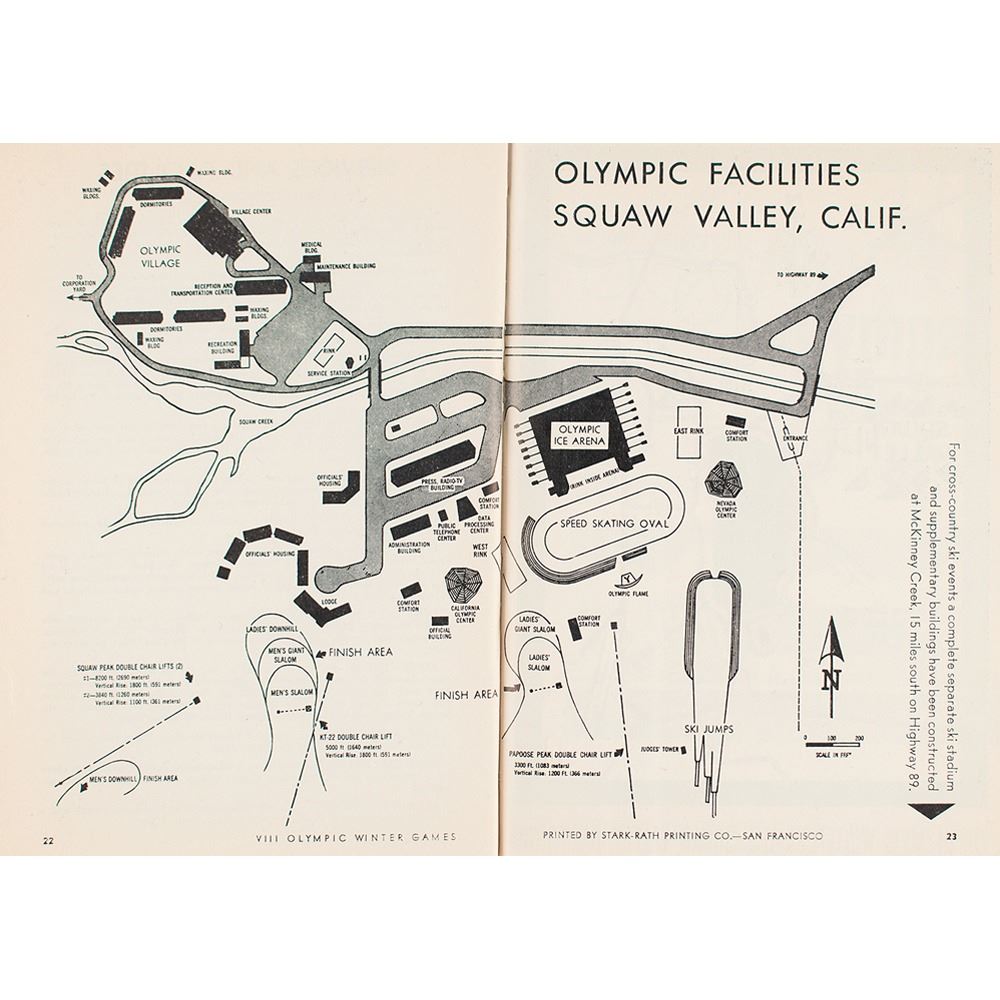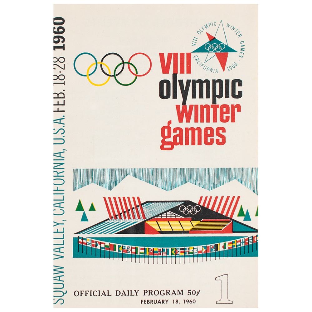 Unusual custom-bound hardcover book containing all 11 official daily programs from the Squaw Valley 1960 Winter Olympics, which ran from February 18 to 28, 1960. The book measures 5.25 x 7.25, contains 252 pages, and features a 4-page appendix for results of February 28th. In fine condition, with some binding wear to opening pages. A scarce and specially bound program book that comprehensively covers the Squaw Valley Olympiad.