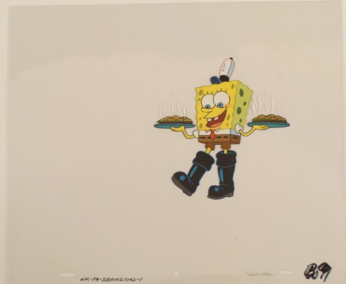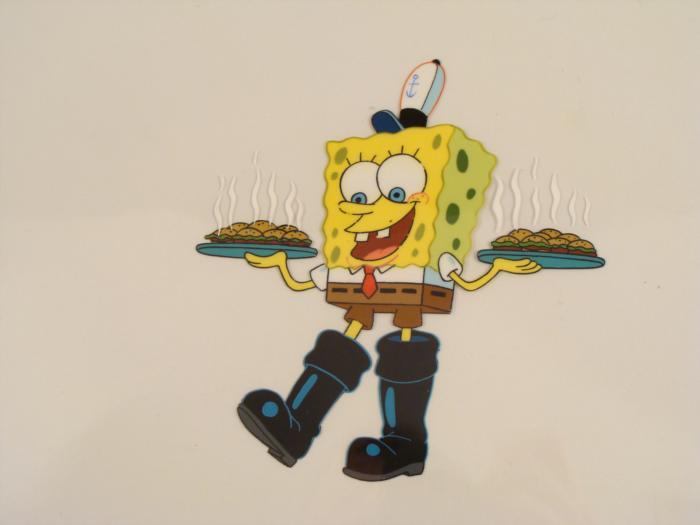 This original animation cel is from the Nickelodeon TV show SpongeBob Squarepants. The story takes place under the deep blue sea in Bikini Bottom, where SpongeBob resides. SpongeBob, who is a yellow, porous sponge, is your typical happy-go-lucky character, as he is always cheerful and enjoys making people laugh. Patrick Star, SpongeBob's neighbor who is a starfish, is your average children's show idiot, as he boasts knowing nothing and is often getting himself into ridiculous situations. Between the homes of these two lies the home of the miserable Squidward, a squid, who is known for being grouchy and playing tricks on SpongeBob and Patrick. Both SpongeBob and Squidward work at the Krusty Krab, a fast food business run by the greedy money-loving Mr. Krabs, a crab, the arch rival of the evil, possibly misunderstood, Plankton. Another neighbor, Sandy Cheeks, an athletic squirrel who normally wears an astronaut's space suit, was introduced in "Tea at the Treedome." She spends most of her time inventing and experimenting. SpongeBob is holding Krabby Patties with his squeaky boots on. Original Production Animated Cel Overall Size of Cel: 10 1/2" x 12 1/2" Very Good ConditionThis is an original hand-painted cel set-up used in the production of an episode of "SpongeBob SquarePants." Each one-of-a-kind set-up represents a slight change in position of the characters. When individually photographed and projected in rapid succession, the images appear to move.
