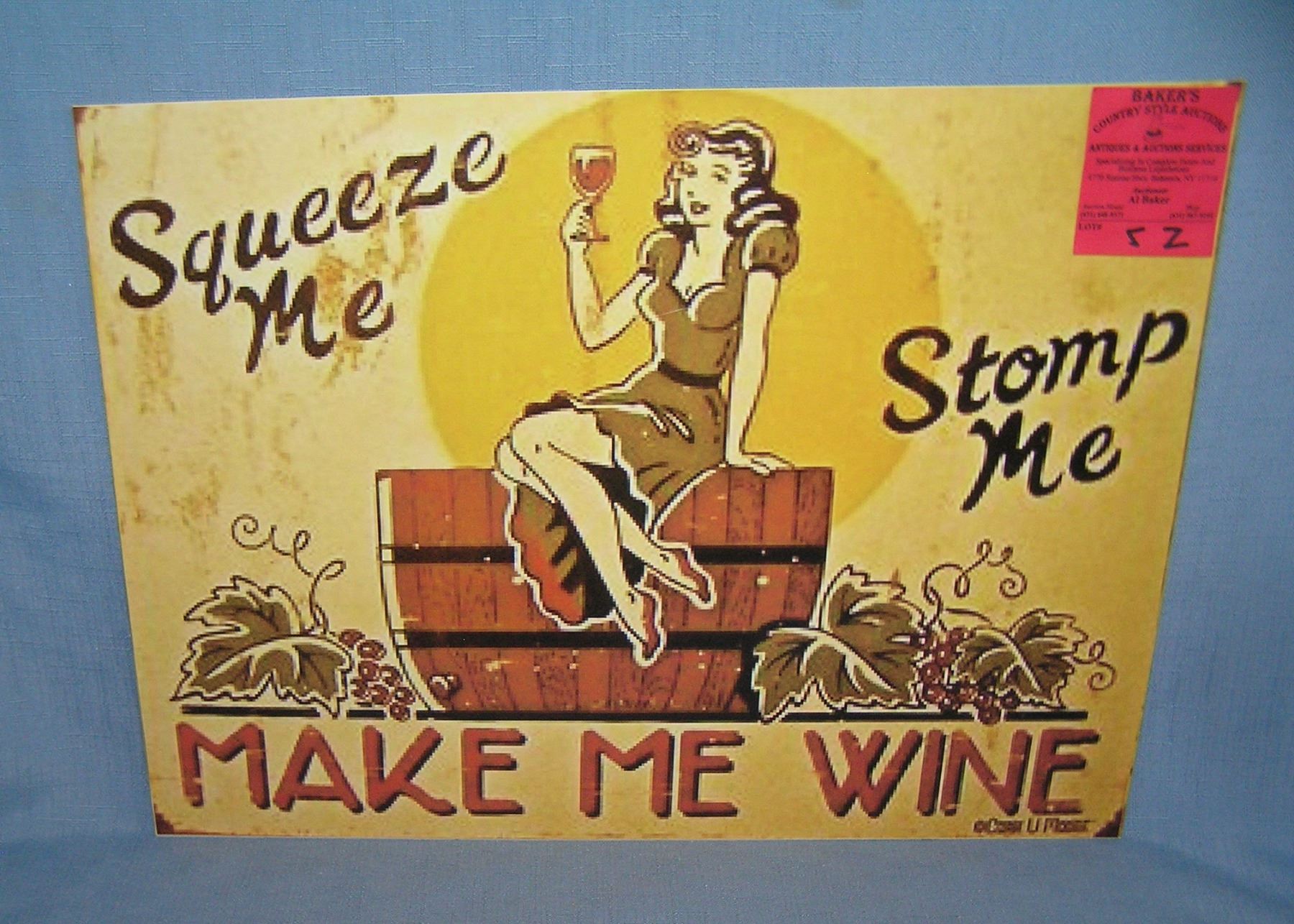 Squeeze Me Stomp Me Make Me Wine retro style advertising sign printed on PVC hard board these signs are auctioned for there decorative and display purposes 12 inches by 16 inches est. value $50.00-$60.00