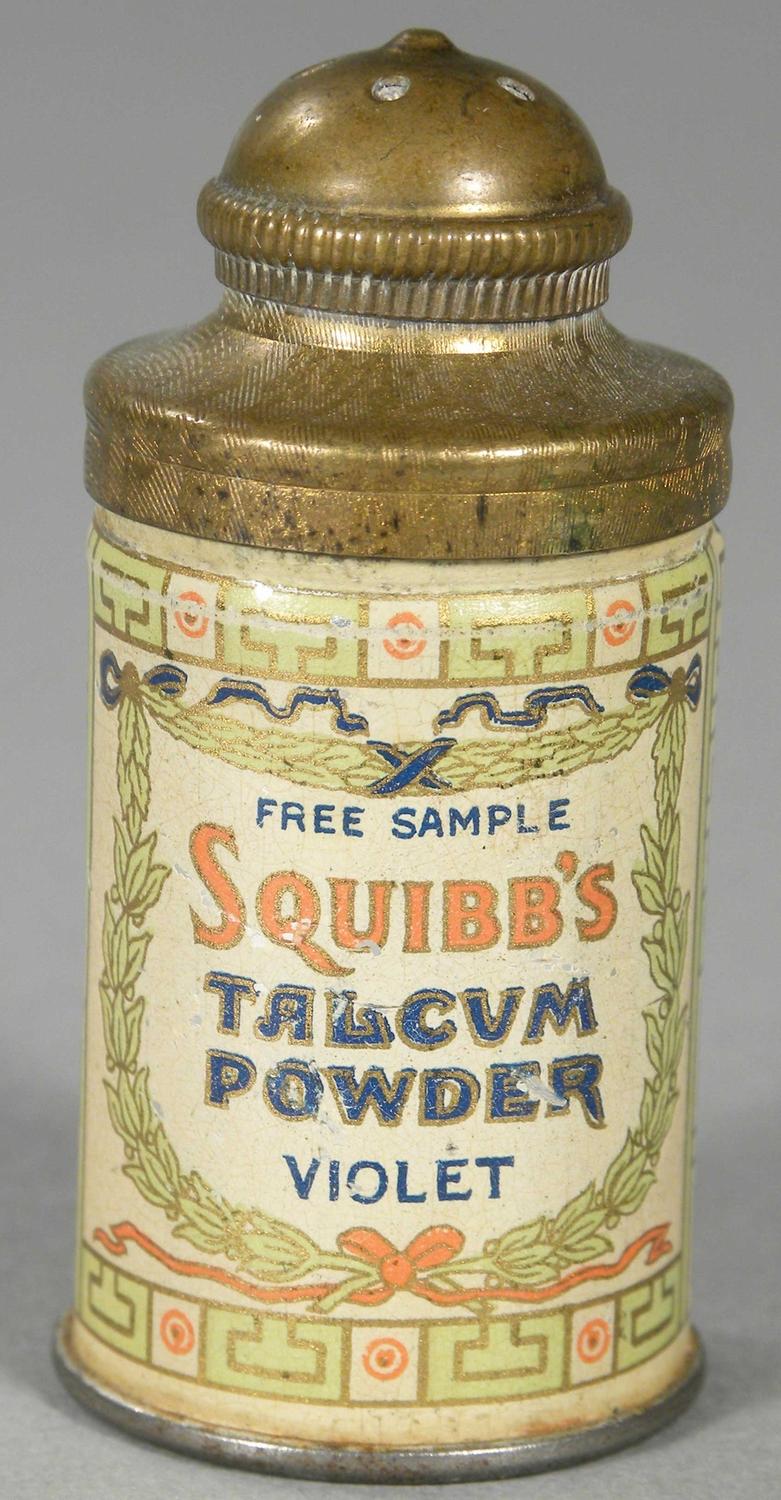 Squibb's Violet Talcum Powder Free Sample Tin. Tin litho. Excellent condition. 2 1/4 inches tall. Start Price $30