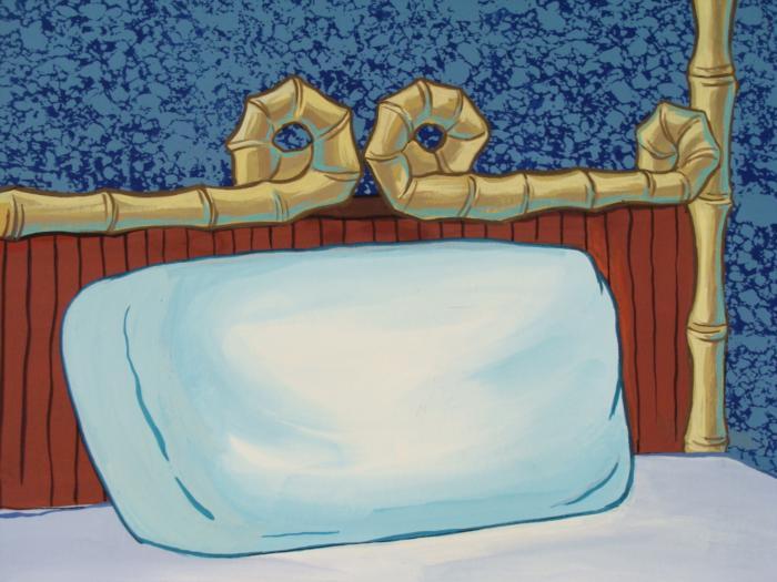 This original hand-painted background from the Nickelodeon TV show SpongeBob Squarepants. The story takes place under the deep blue sea in Bikini Bottom, where SpongeBob resides. SpongeBob, who is a yellow, porous sponge, is your typical happy-go-lucky character, as he is always cheerful and enjoys making people laugh. Patrick Star, SpongeBob's neighbor who is a starfish, is your average children's show idiot, as he boasts knowing nothing and is often getting himself into ridiculous situations. Between the homes of these two lies the home of the miserable Squidward, a squid, who is known for being grouchy and playing tricks on SpongeBob and Patrick. Both SpongeBob and Squidward work at the Krusty Krab, a fast food business run by the greedy money-loving Mr. Krabs, a crab, the arch rival of the evil, possibly misunderstood, Plankton. Another neighbor, Sandy Cheeks, an athletic squirrel who normally wears an astronaut's space suit, was introduced in "Tea at the Treedome." She spends most of her time inventing and experimenting. This appears to be Squidward's bedOriginal Production Background Overall Size of Background: 10 1/4" x 14 1/2" Very good conditionOriginal Production Backgrounds are used in the making of the final version of animated productions. The background establishes the location and the overall good mood of the scenee. Typically, a background layout artist creates a drawing to establish the content of the scene, placement of characters, perspective and camera angle. Based on this drawing, the background artist creates a preliminary painting to confirm all of the scenes details, then the final production background which is used in the filming of the scene. When these backgrounds are individually photographed behind the progression of production cels, and projected at a rapid succession, the images in the foreground appear to move, creating an animated scene. The background is ready to be matted and framed. It is a colored background with the animator's notations at the bottom.
