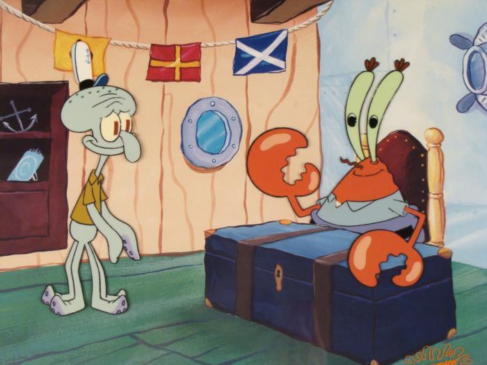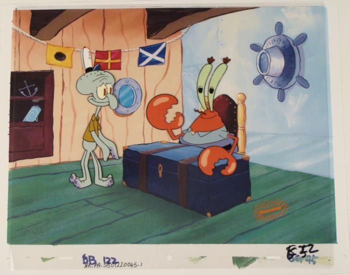 This original animation cel is from the Nickelodeon TV show SpongeBob Squarepants. The story takes place under the deep blue sea in Bikini Bottom, where SpongeBob resides. SpongeBob, who is a yellow, porous sponge, is your typical happy-go-lucky character, as he is always cheerful and enjoys making people laugh. Patrick Star, SpongeBob's neighbor is a starfish who boasts knowing nothing and is often getting himself into ridiculous situations. Between the homes of these two lies the home of the miserable Squidward, a squid, who is known for being grouchy and playing tricks on SpongeBob and Patrick. Both SpongeBob and Squidward work at the Krusty Krab, a fast food business run by the greedy money-loving Mr. Krabs, a crab, the arch rival of the evil, possibly misunderstood, Plankton. Another neighbor, Sandy Cheeks, an athletic squirrel who normally wears an astronaut's space suit, was introduced in "Tea at the Treedome." She spends most of her time inventing and experimenting. In this cel, Squidward is in the office of Mr. Krabs (maybe he should ask for a raise!). Original Production Animated Cel Overall Size of Cel: 10 1/2" x 12 1/2" Excellent ConditionPrinted background copy, 11" x 13 3/4"To create production cels, the original animator's drawing is transferred onto an acetate cel (by hand-inking and/or photo copying). The cel is then hand-painted on the reverse side. The cel is ready to be matted and framed. Peg holes and animator's notations are at the bottom of the cel. It is a multi-layer cel, with each character on a separate sheet.