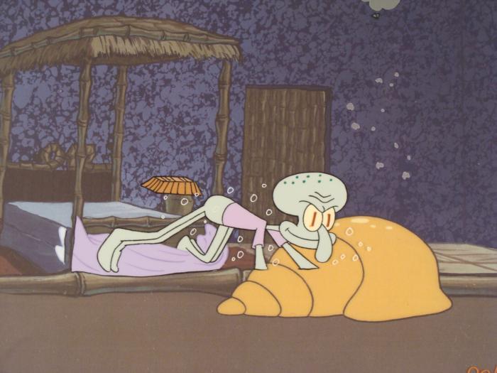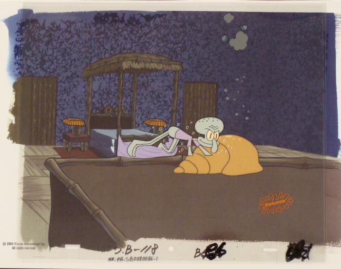 This animation cel and reproduction background are from the Nickelodeon TV show SpongeBob Squarepants. The story takes place under the deep blue sea in Bikini Bottom, where SpongeBob resides. SpongeBob, who is a yellow, porous sponge, is your typical happy-go-lucky character, as he is always cheerful and enjoys making people laugh. Patrick Star, SpongeBob's neighbor who is a starfish, is your average children's show idiot, as he boasts knowing nothing and is often getting himself into ridiculous situations. Between the homes of these two lies the home of the miserable Squidward, a squid, who is known for being grouchy and playing tricks on SpongeBob and Patrick. Both SpongeBob and Squidward work at the Krusty Krab, a fast food business run by the greedy money-loving Mr. Krabs, a crab, the arch rival of the evil, possibly misunderstood, Plankton. Another neighbor, Sandy Cheeks, an athletic squirrel who normally wears an astronaut's space suit, was introduced in "Tea at the Treedome." She spends most of her time inventing and experimenting. Squidward is out of bed.Original Printed Background and Animated Cel Overall Size of Background: 11" x 17" Overall Size of the Cel: 10 1/2" x 12 1/2" Very good condition This is an original hand-painted cel set-up used in the production of an episode of "SpongeBob SquarePants." Each one-of-a-kind set-up represents a slight change in position of the characters. When individually photographed and projected in rapid succession, the images appear to move.
