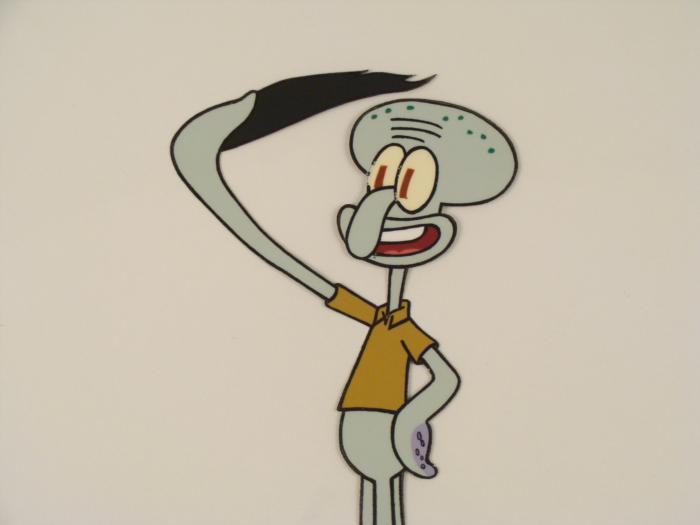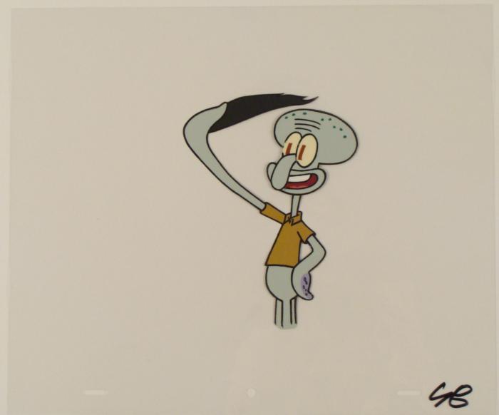 This original animation cel is from the Nickelodeon TV show SpongeBob Squarepants. The story takes place under the deep blue sea in Bikini Bottom, where SpongeBob resides. SpongeBob, who is a yellow, porous sponge, is your typical happy-go-lucky character, as he is always cheerful and enjoys making people laugh. Patrick Star, SpongeBob's neighbor who is a starfish, is your average children's show idiot, as he boasts knowing nothing and is often getting himself into ridiculous situations. Between the homes of these two lies the home of the miserable Squidward, a squid, who is known for being grouchy and playing tricks on SpongeBob and Patrick. Both SpongeBob and Squidward work at the Krusty Krab, a fast food business run by the greedy money-loving Mr. Krabs, a crab, the arch rival of the evil, possibly misunderstood, Plankton. Another neighbor, Sandy Cheeks, an athletic squirrel who normally wears an astronaut's space suit, was introduced in "Tea at the Treedome." She spends most of her time inventing and experimenting. Why is Squidward taking off his wig?Original Production Animated Cel Overall Size of Cel: 10 1/2" x 12 1/2" Very Good ConditionThis is an original hand-painted cel set-up used in the production of an episode of "SpongeBob SquarePants." Each one-of-a-kind set-up represents a slight change in position of the characters. When individually photographed and projected in rapid succession, the images appear to move.