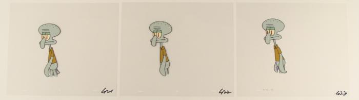 To create production cels, the original animator's drawing is transferred onto an acetate cel (by hand-inking and/or photo copying). The cel is then hand-painted on the reverse side. The cel is ready to be matted and framed. The animator's notations are at the bottom of the cel. There is some slight paint fade to Squidward's outline. The cels are all in a sequential order. There are three different cels of Squidward walking.
