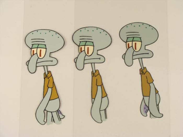 This original animation cel is from the Nickelodeon TV show SpongeBob Squarepants. The story takes place under the deep blue sea in Bikini Bottom, where SpongeBob resides. SpongeBob, who is a yellow, porous sponge, is your typical happy-go-lucky character, as he is always cheerful and enjoys making people laugh. Patrick Star, SpongeBob's neighbor who is a starfish, is your average children's show idiot, as he boasts knowing nothing and is often getting himself into ridiculous situations. Between the homes of these two lies the home of the miserable Squidward, a squid, who is known for being grouchy and playing tricks on SpongeBob and Patrick. Both SpongeBob and Squidward work at the Krusty Krab, a fast food business run by the greedy money-loving Mr. Krabs, a crab, the arch rival of the evil, possibly misunderstood, Plankton. Another neighbor, Sandy Cheeks, an athletic squirrel who normally wears an astronaut's space suit, was introduced in "Tea at the Treedome." She spends most of her time inventing and experimenting. Where is Squidward walking to?Original Production Animated Cel Overall Size of Cel: 10 1/2" x 12 1/2" Very Good ConditionThis is an original hand-painted cel set-up used in the production of an episode of "SpongeBob SquarePants." Each one-of-a-kind set-up represents a slight change in position of the characters. When individually photographed and projected in rapid succession, the images appear to move.
