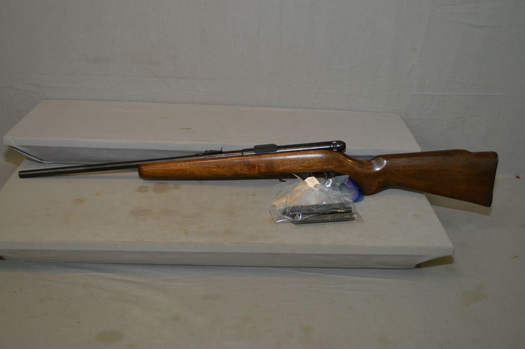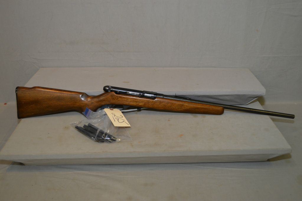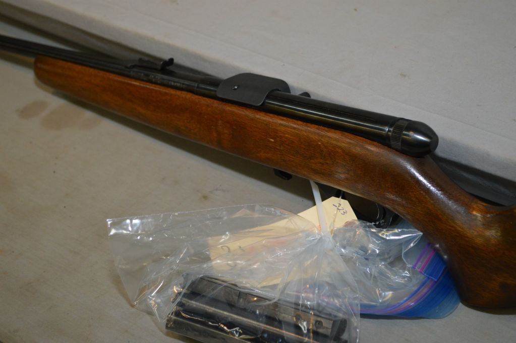 Squires Bingham Model 20 .22 LR Cal Mag Fed Semi Auto Rifle w/ 20 3/4" bbl [ blued finish, missing front sight, has brass shield, pistol grip stock w/ few marks, c/w two extra mags ] Ser # A168185