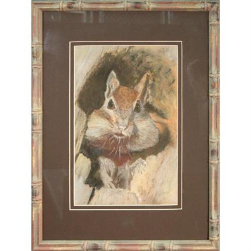 ?Squirrel Peeking? is a wonderfully detailed, original chalk pastel drawing by talented artist R. Brown. A squirrel, seemingly surprised, peeks out of its tree niche to survey the area. Its cheeks are stuffed with the day?s gatherings that may be deposited in its secret burrow within the trunk. Brown has rendered the squirrel in great detail as everything, down to each tiny whisker is fully articulated. The skillful use of light and shadow gives depth to the composition as the niche in which the squirrel is nesting fades into darkness beyond it?s head. The piece has been double matted in deep umber which echoes the areas of shadow within the drawing. It has been mounted in a bamboo style frame with a rich patina showcasing hints of browns, reds, and golds that compliment the earthy tones of the tree trunk and bringing the total measurements to 16 ¾? x 22 ¼?. The unique matting and framing presentation of this piece was individually selected and created by Le Chateau?s renowned master framer, Jeanette Shoenrock, and bears her signature on the back. The artist?s signature can be seen in the lower left corner reading ?R. Brown.? This is truly a charming animal portrait that would be an affordable way of bringing the outdoors, indoors, or the perfect gift for the animal lover in your family.