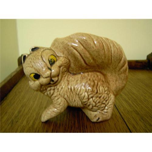 This bushy tailed critter has character! and is probably adorable holding a plant or flowers. Done in colors of tan with black and yellow accents. Some of the accent color has chipped off. Measures approx. 4.5"x6"x3"; No mark or label; no chips or cracks. PAYPAL Accepted. USD only.