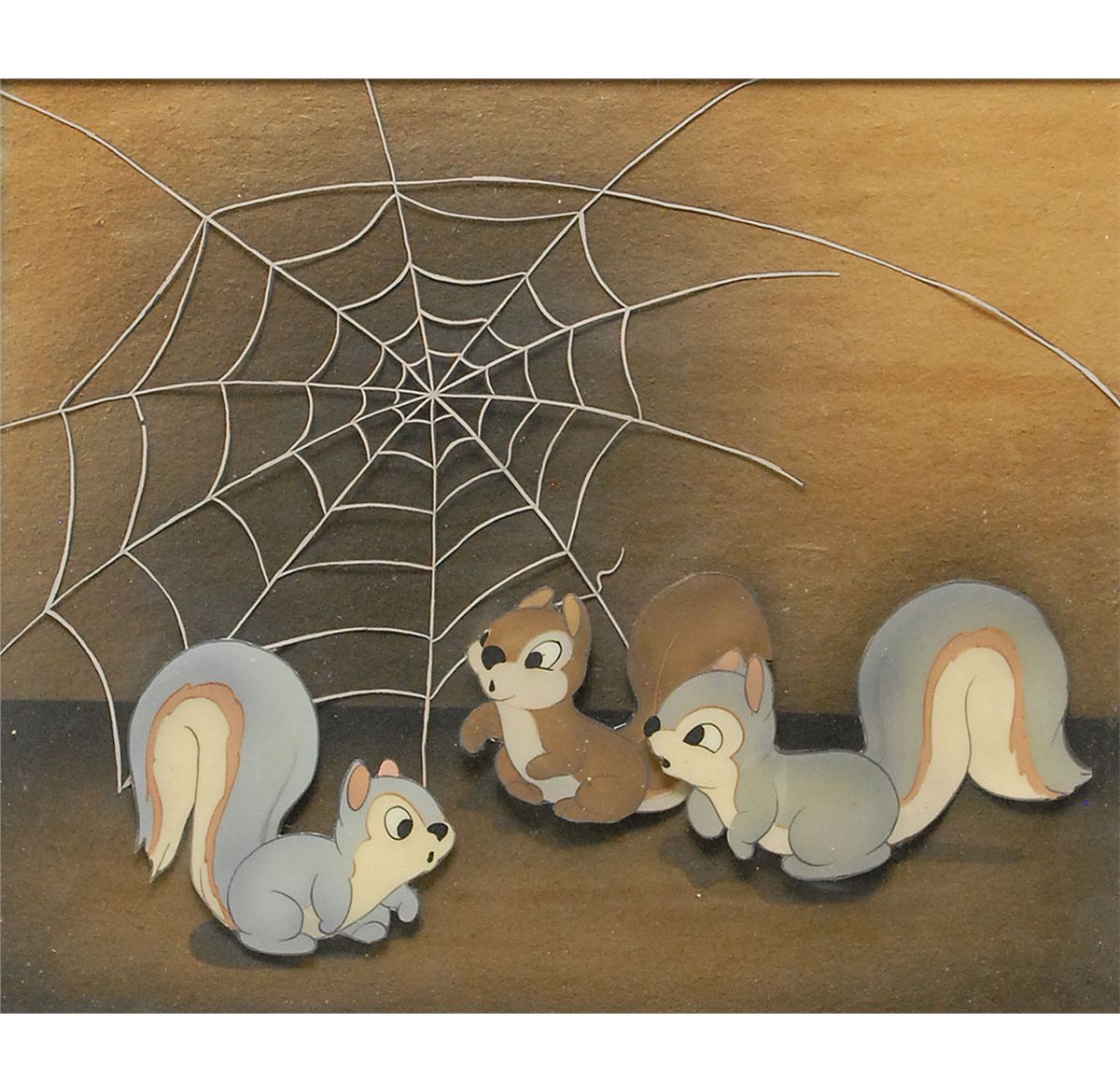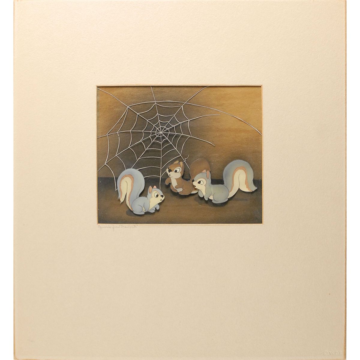 (Walt Disney Studios, 1937) Original production cel featuring squirrels with a spider web from Snow White and the Seven Dwarfs, showing the three creatures gathered in front of the large web. The cel has been trimmed and applied to an airbrushed background as prepared by the Disney Studio to be sold at the Courvoisier Galleries. Image measures 5.5 x 2.5, with a mat opening of 6.75 x 5.75. Mat dimensions are 13.75 x 15. In fine condition.
