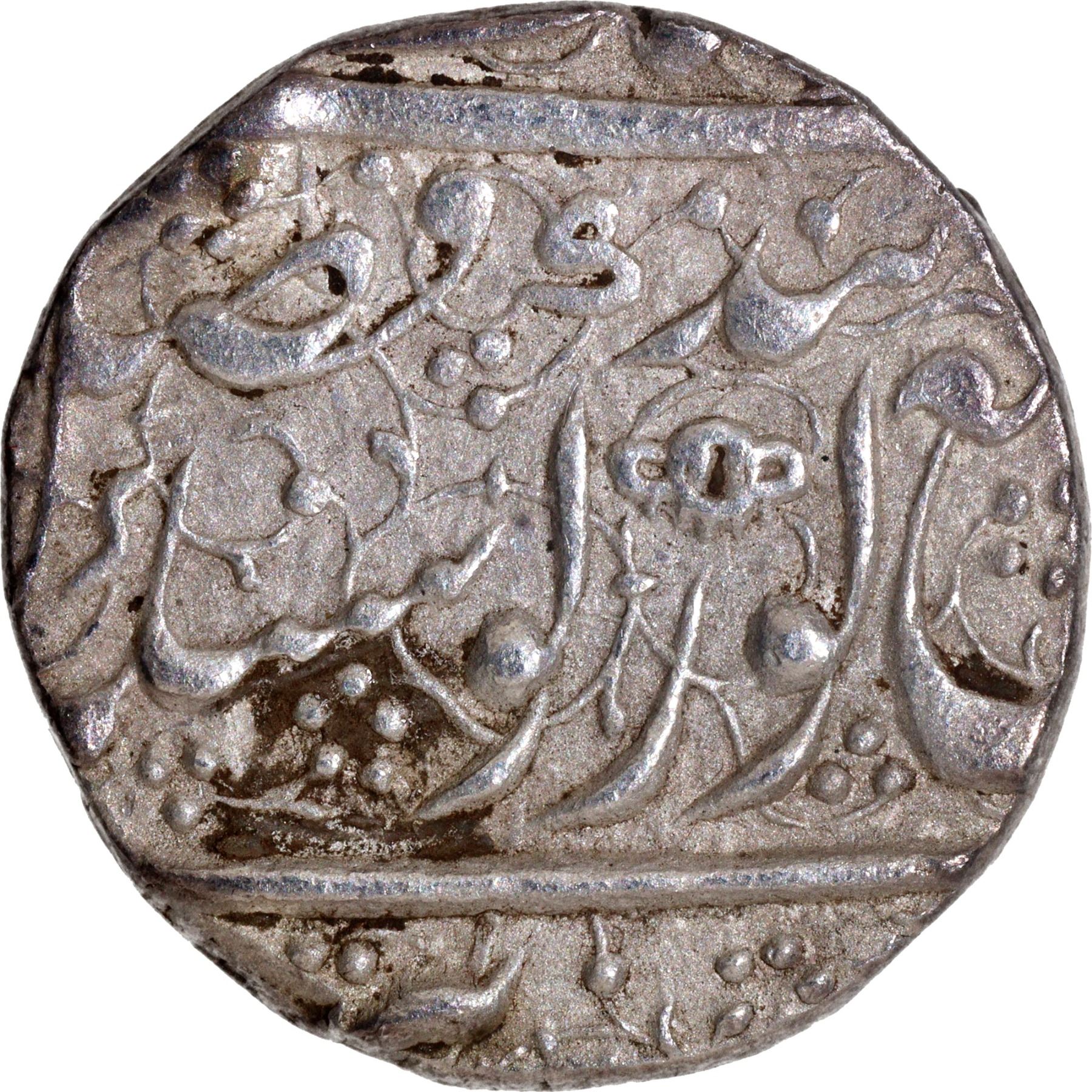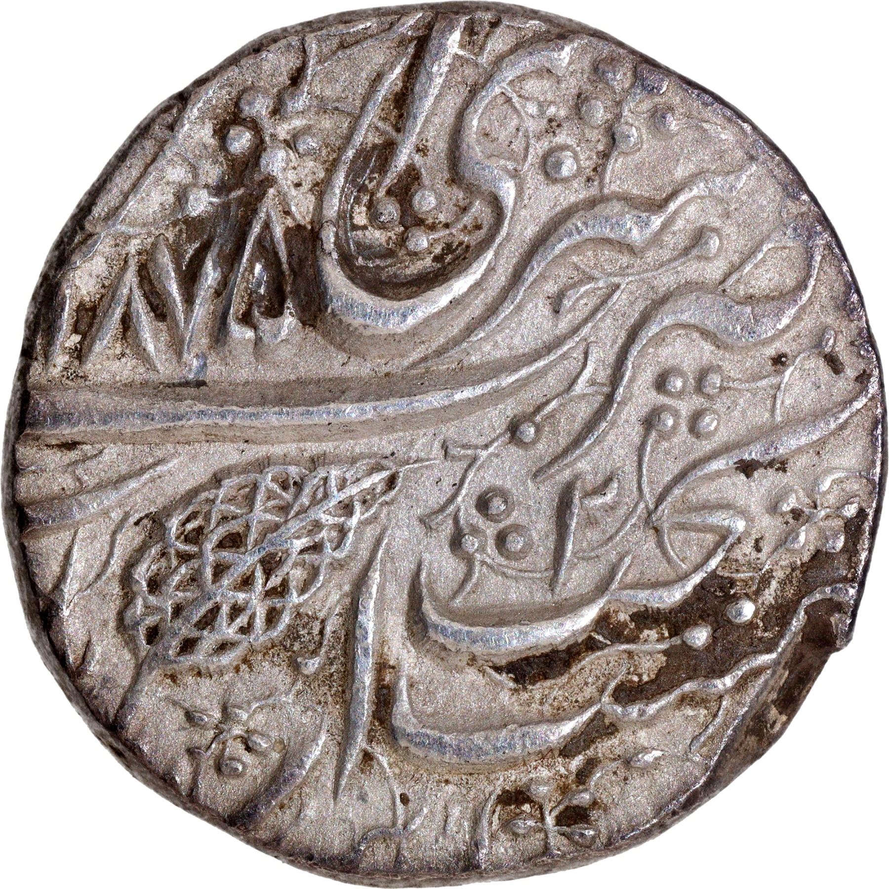 Sikh Empire, Ranjit Singh (VS 1856-1896/1799-1839 AD), Sri Amritsar Mint, Silver Rupee, VS 1875/2 RY, (1818), 'Nanakshahi' Couplet, Obv: Persian legend "Sikka zad bar har do 'Alam fazl-e-sachha sahib ast, Fateh tegh-i-guru Gobind Singh shah Nanak Wahab ast", Rev: Persian legend "zarb Sri Amritsar jiyo, Takht Akal Bakht" & Vikram Samvat year 1875 with leaf, 10.93g, 22.77mm, (Gurprit # 1.39.01), very attractive, about extremely fine, Scarce.