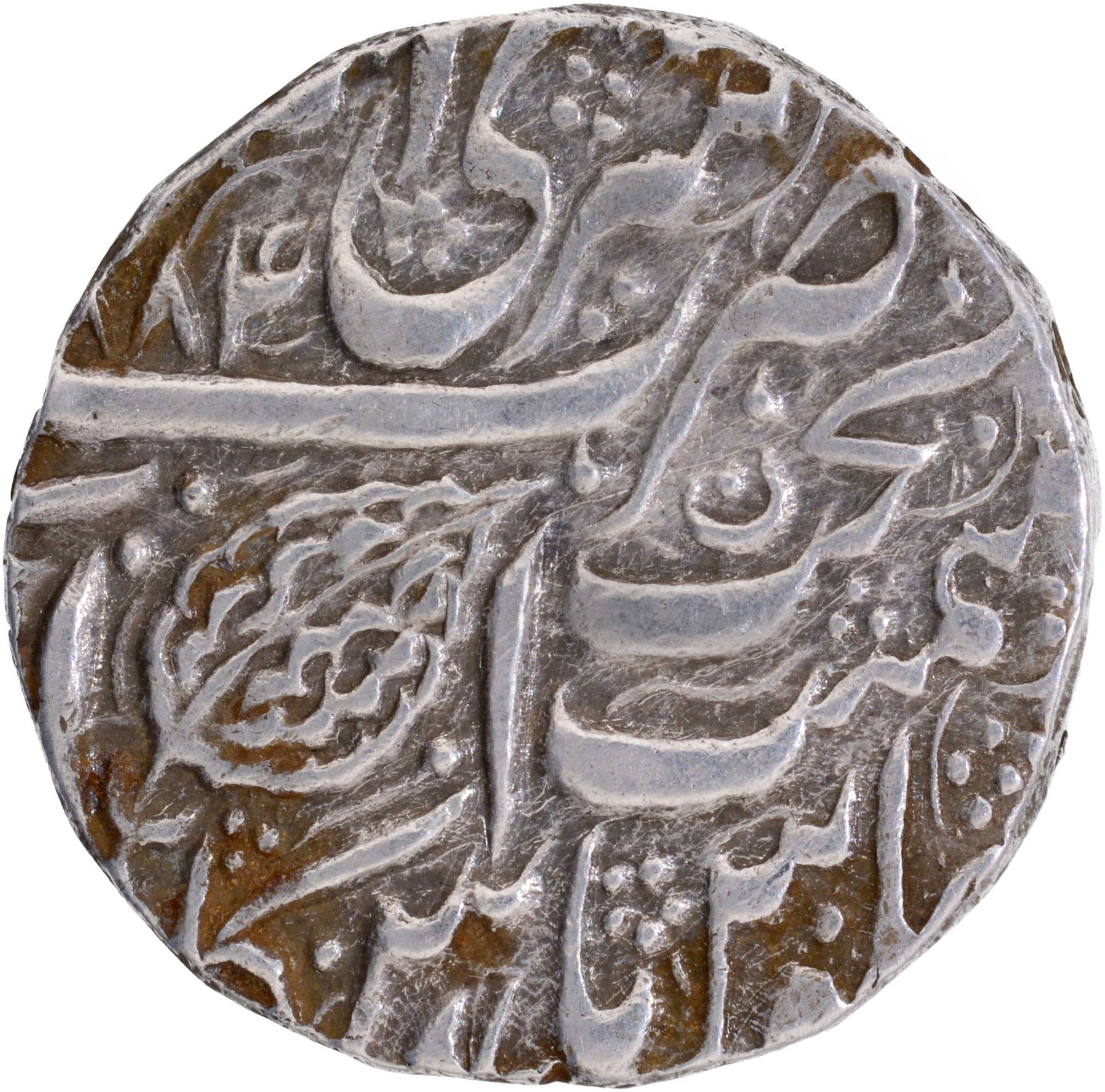 Sikh Empire,Ranjit Singh (VS 1856-1896 /1799-1839 AD), SriAmritsar,Silver Rupee, VS1884 /95, later Gobind Shahi series, 1st issue of frozen year series,Gobind Shahi Couplet,Obv:Persian legend deg Fateh-o nusrat be-dirang, yaft az Nanak Guru Gobind Singh,Rev:Persian legend zarbSri Amritsar at the top,Bakht Akal Takht memanat julus manus with leaf symbol,10.97g, 23.63mm,(Gurprit # 1.81.01),about extremely fine,Very Scarce.