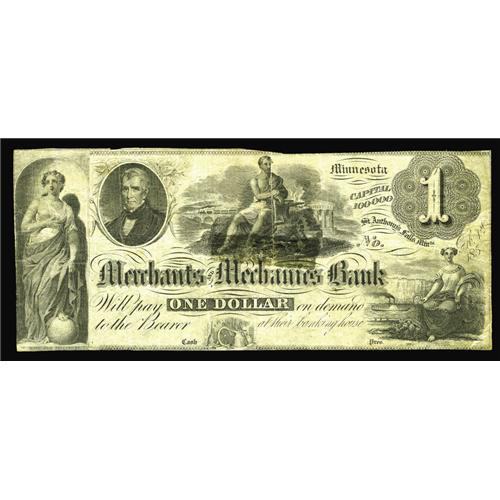 <B>St. Anthony's Falls, MN- Merchants & Mechanics Bank</B></I> $1 G2<BR>A remainder, as are all surviving notes from this short lived banking venture. <B>Fine,</B></I> with a small tape stain on the reverse.