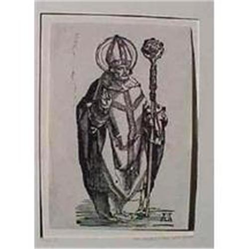 St ArnSt Arnolph(Standing Bishop) after Durer of the Nuremberg School, good impression but a bit over inked. Size 5 1/1 w x 8 1/8 h. Watermark of double eagle and crown.<p>By way of AAA when they closed out their early European stockolph(Standing Bishop) after Durer