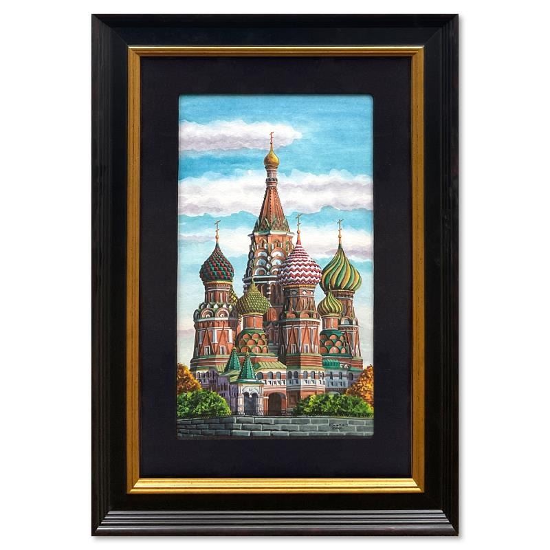 "St. Basils" is an original watercolor painting on paper by Eugene Gromov, hand signed by the artist. This piece comes framed. Includes Letter of Authenticity. Measures approx. 24" x 17" (frame), 16" x 9.5" (image). There is some wear on the frame.