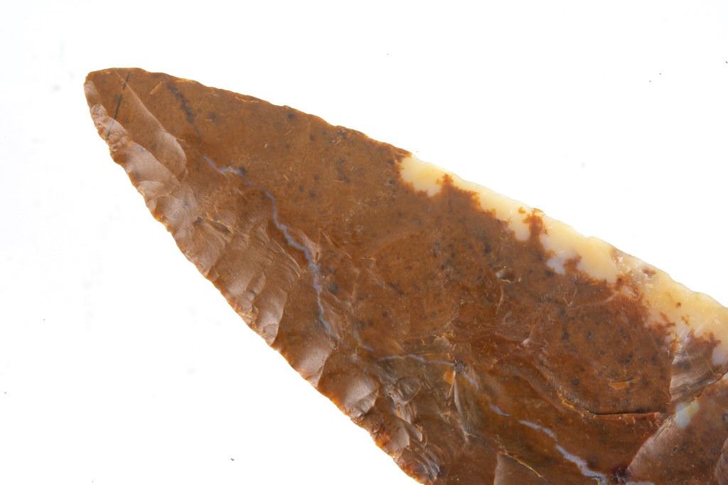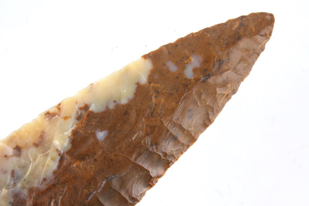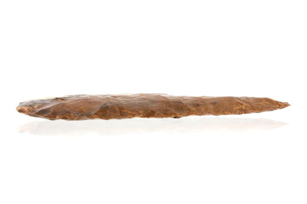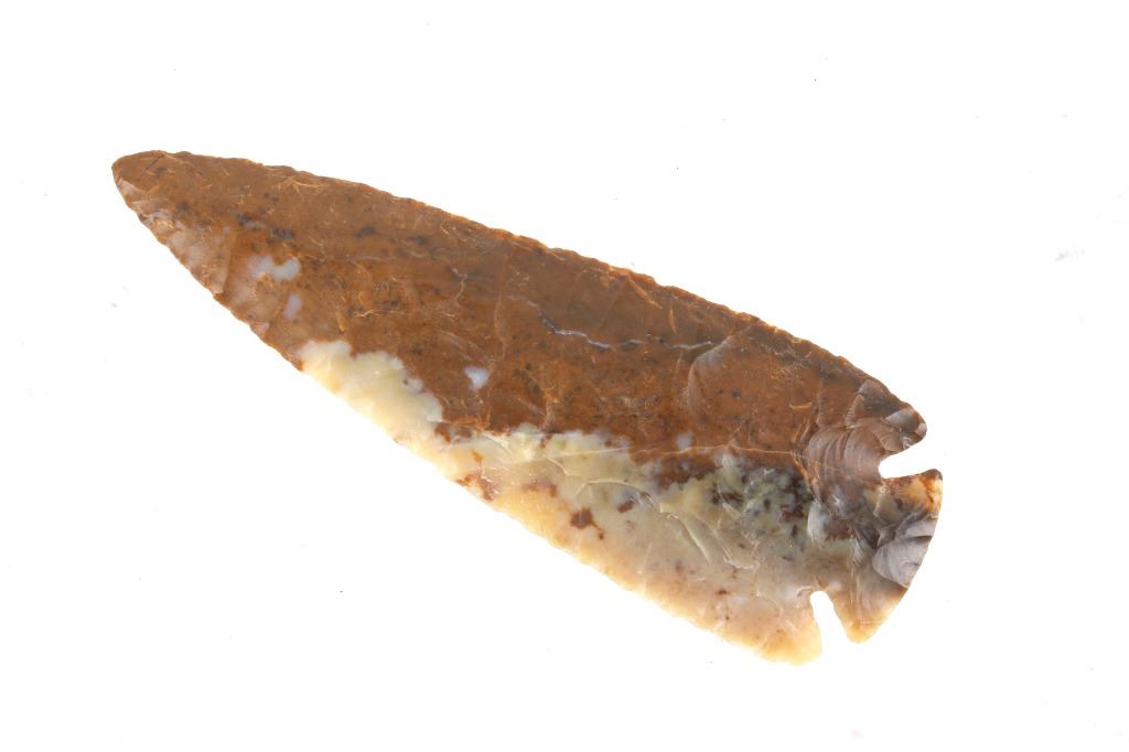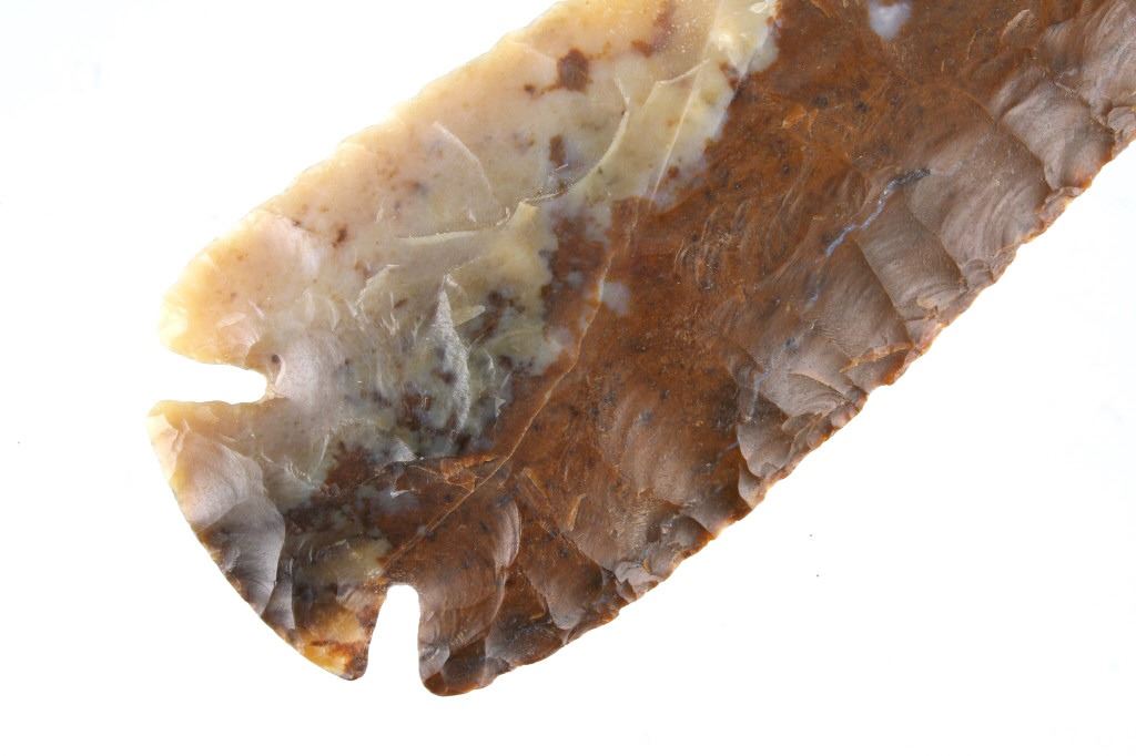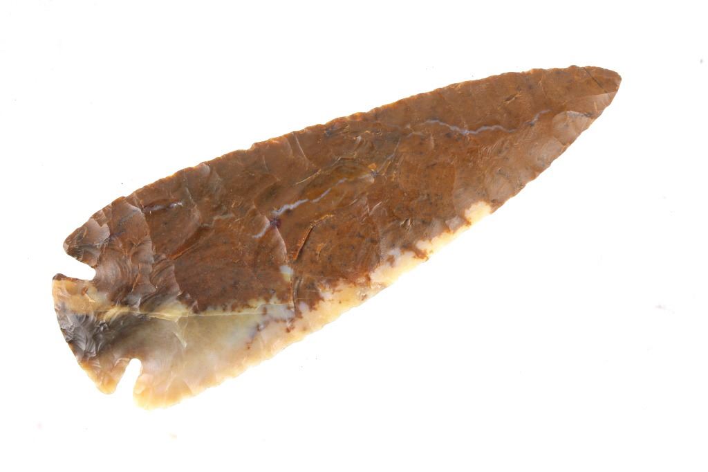 For your consideration is this St. Charles Dovetail Point and is aged from 10,000 - 8,000 B.P and from the Early Archaic period. This is large corner notched point with rhomboid cross section and shows a long recurvate blade and shows a beveled example with round shoulders and a convex stems. The material this point is made from ridge flint material. The condition of this point is good with no obvious signs of damage and in good museum quality condition. The measurements of this point are 5" x 1 3/4".