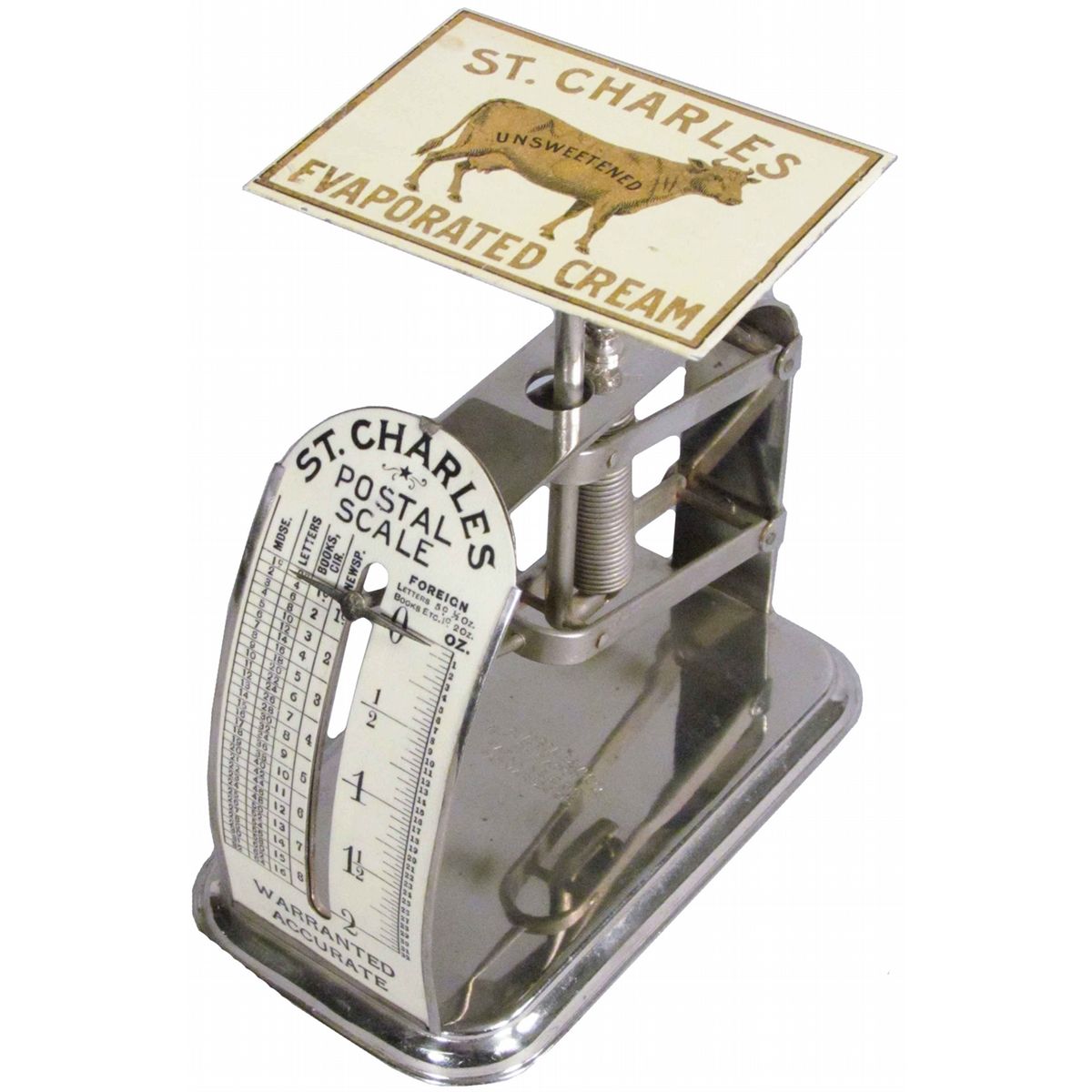 St. Charles Evaporated Cream Advertising Postal Scale. Tin litho top with celluloid weight chart on front. Deluxe Scale & Mfg. Co. Chicago. Excellent condition. 3 1/4 X 6 X 5 3/4 inches.