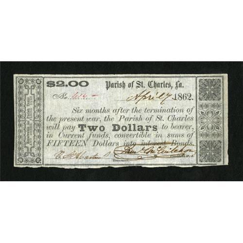 <B>St. Charles, LA- Parish of St. Charles </B></I>$2 April 7, 1862<BR> This evenly circulated piece shows bold signatures and problem-free paper. <B>Fine.</B></I><BR><I>From The Collection of a Louisiana Gentleman</B></I><BR><BR><b>Shipping:</b> Coins & Currency (<a target="_blank" href="http://www.heritageauctions.com/common/shipping.php">view shipping information</a>)