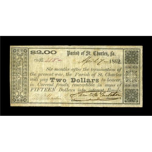 <B>St. Charles Parish, LA- Parish of St. Charles</B></I> $2 April 7, 1862<BR>An attractive note from this very scarce Parish, with this piece printed on the backs of recycled New Orleans merchant scrip. <B>Very Fine-Extremely Fine.</B></I><BR><BR><b>Shipping:</b> Coins & Currency (<a target="_blank" href="http://www.heritageauctions.com/common/shipping.php">view shipping information</a>)
