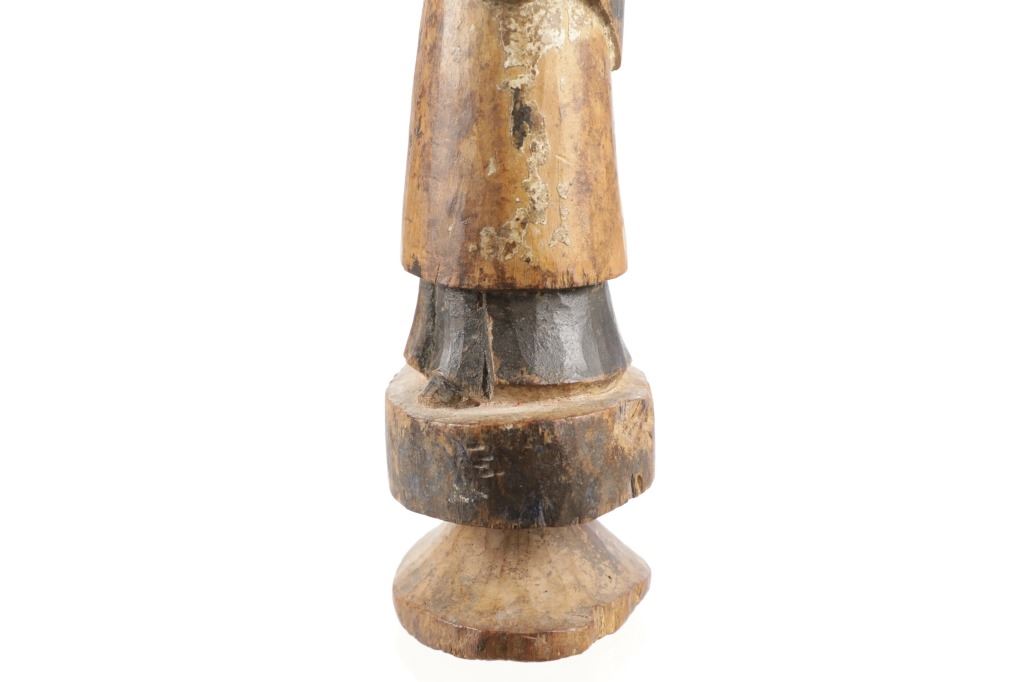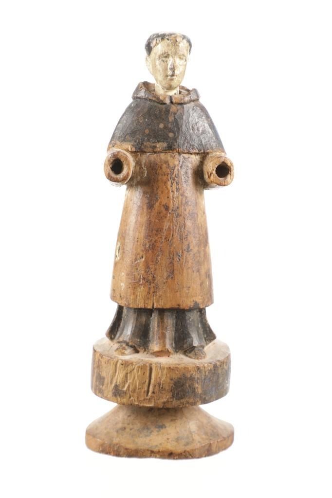 For your consideration is a St. Francis 18th C. Carved Wood Polychrome Santo Statue, from Spain. a Classic hand carved Spanish figure of St. Francis. The depiction of the saint in priestly garb is raised on its original plinth base. Appears to be carved from one piece of wood. A santo is a piece of one of various religious art forms found in Spain and areas that were colonies of the Kingdom of Spain, consisting of wooden or ivory statues that depict various saints, angels, or Marian titles, or one of the personages of the Holy Trinity. This hand-carved arms outstretched Santo features wonderful detail. Original white paint mostly faded though still visible on head/neck, original black paint still colours upper cloak and lower robe and shoes; black still visible on hair. Hands were removed, gouges and insect damage noted. Measures approx. 11.25"H x 4.25"W base diameter, 3.25"D, approx weight 12oz.