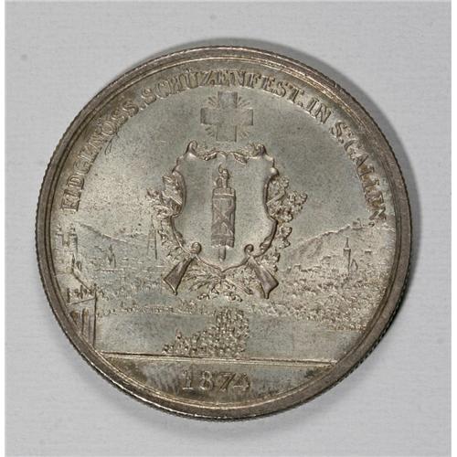 <B>St Gallen. 5 Francs 1874,</B></I> KM-S12, issued for the shooting festival, Choice UNC with subtle, well-set silvery toning, hues of gold. Mintage was 15,000 for this festival.<BR><I>From the Shinholser Collection</B></I><BR><BR><b>Shipping:</b> Coin/Currency (<a target="_blank" href="http://www.heritageauctions.com/common/shipping.php">view shipping information</a>)