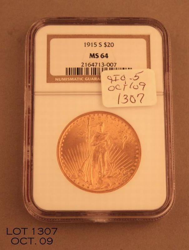 St. Gauden’s Twenty Dollar gold piece dated 1915-S NGC graded MS64 in slab. Est.: $1,300-$2,200.