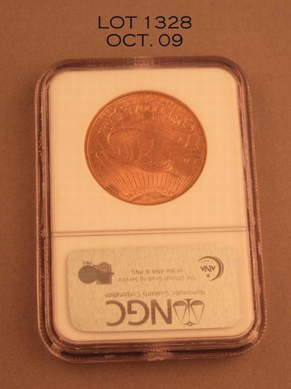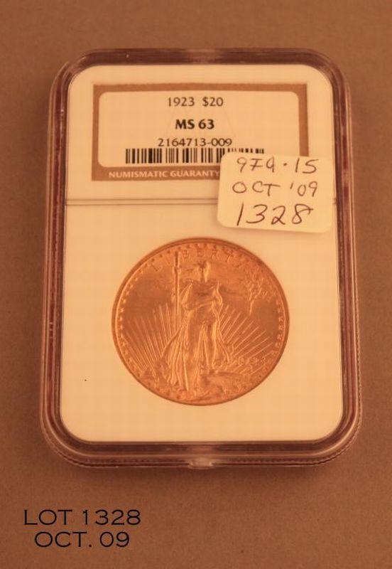 St. Gauden’s Twenty Dollar gold piece dated 1923 NGC graded MS63 in slab. Est.: $1,100-$1,800.