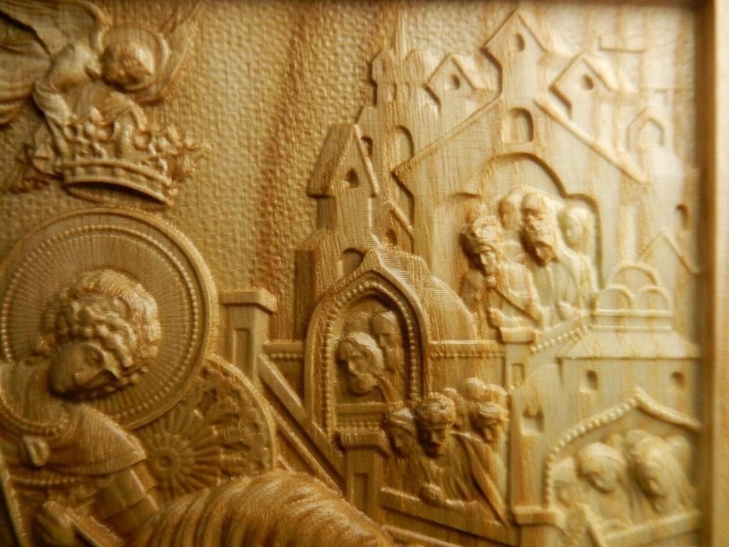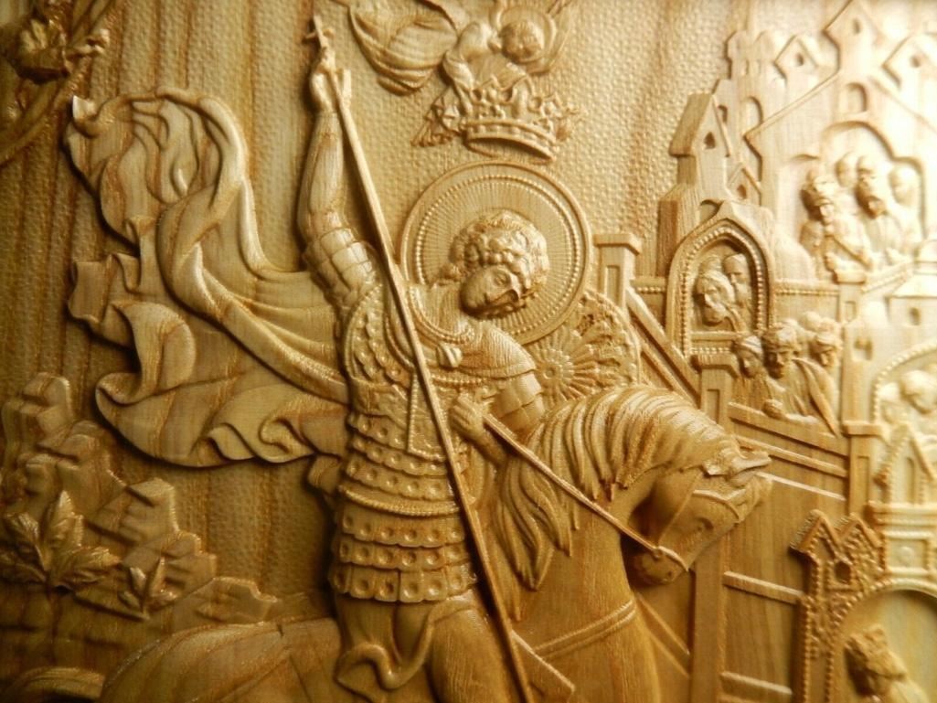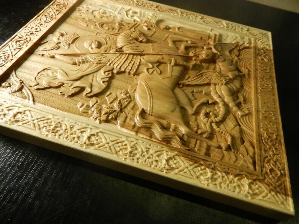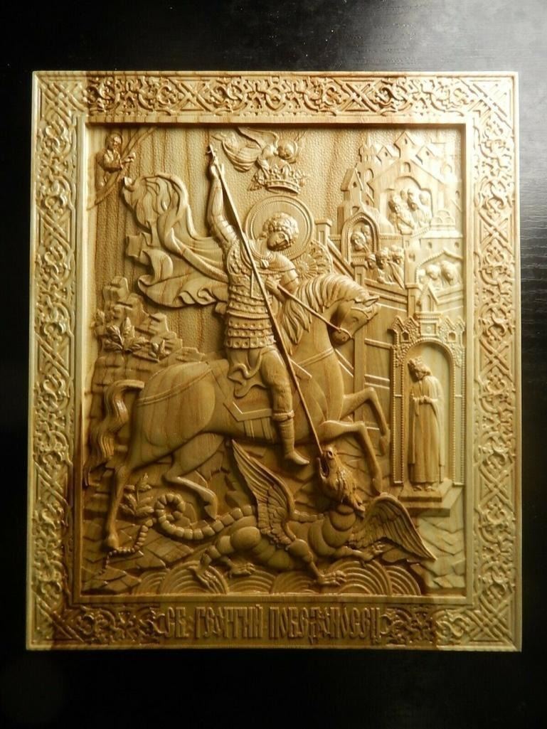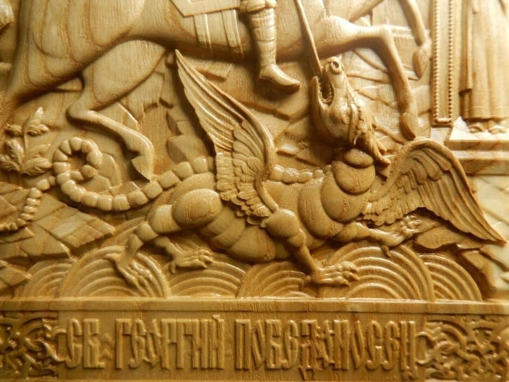 Carved wooden plaque, Icon, St. George & The Dragon. Created from ash tree wood by Lithuanian artisan. Hard wax oil finish. Hanger attached to back. 8" X 9 1/2".Â