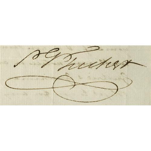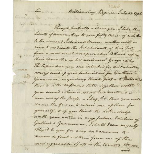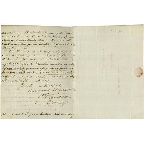 <B>St. George Tucker writes to Philadelphia publisher Mathew Carey about Charles Wilson Peale's American Museum.</B></I> Two pages, measuring 7" x 8.25", plus address panel. Very good condition. Written July 31, 1795 at Williamsburg, Virginia. The letter addressed to bookseller/publisher Matthew Carey of Philadelphia reads in full, "Sir, Though perfectly a stranger. I take the liberty of transmitting to you fifty copies of a letter to the reverend Jebediah Mann written with a view to vindicate the inhabitants of the city from a most cruel and unprovoked attack upon their character in this universal geography. The copies sent you are intended for distribution among several of your subscribers for Guthrie's Grammar, as you may think proper to transmit them to in the different states together with your second volume which I understand is now out of the press. I beg, sir, that you will do me the favor to return one of them for yourself, and if you think the letter itself worth your notice in any future edition of Guthrie's Grammar, I shall deem myself obliged to you for any endeavor to remove too foul a stain from me of the most agreeable spots in the United States which may likewise boast some of the most respectable characters for its inhabitants. If you could advise me to what Booksellers in New York and Boston to send some copies for distribution, I should be much obliged to you. Since I have taken the liberty of writing to you permit me to ask whether you have no intentions of reviving the American Museum. The discontinuance of it is valuable a work I really consider as a public injury, unless you can assign such good reasons for so doing as to under it a misfortune, only a few lines by past will be an additional obligated to them which I have solicited. I am sir, with respect, your obedient hble serv't. Geo. Tucker." St. George Tucker was a lawyer, trader, inventor, scholar, professor, judge, essayist, poet, avid gardener, and amateur astronomer <BR><BR>The American Museum referred to in this letter is that opened by artist Charles Wilson Peale. The Peale Museum, as it is called now, is part of the Academy of Natural Sciences in Philadelphia. The museum's collection started as a combination of Peale's portraits of Revolutionary War heroes and an assortment of curiosities and grew to include animal, mineral, and ethnographic specimens. The public loved the blend of American heroes and nature. It resonated with a citizenry eager to establish a new national identity that would both differentiate the young country from Europe and proclaim it as the standard bearer of civilization's progress. The collection grew substantially through both the direct efforts of Peale himself and through the donations of others. The museum also became a repository for the collection of the American Philosophical Society, including many of the fossils donated by Thomas Jefferson. Although it never achieved official status or government funding, the museum was the de facto national museum. For instance, it became the home for many of the Native American artifacts and natural history specimens collected during the Lewis and Clark and other government-sponsored expeditions.