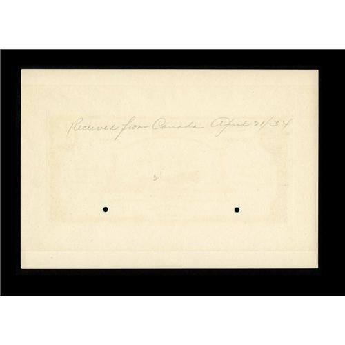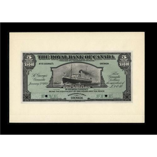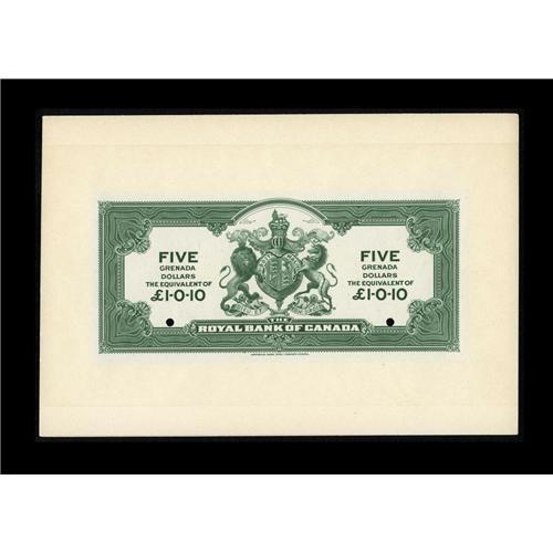 <B>St. George's, Grenada- Royal Bank of Canada</B></I> $5 Jan. 2, 1920 Ch. 630-48-02 Face and Back Proofs<BR>Both of these card mounted proofs are unlisted in Charlton. They have been punch cancelled twice. <B>Choice Crisp Uncirculated</B></I> with "Received from Canada April 21/34" on the back plus other pencilled control markings.<BR><I>From The Halton Lake Collection</B></I>
