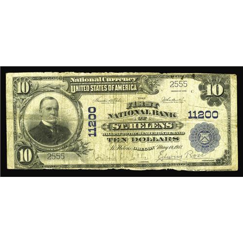 <B>St. Helens, OR</B></I> - $10 1902 Plain Back Fr. 632 <B>The First NB </B></I> Ch. # 11200<BR>This bank is just plain rare with Kelly accounting for only 6 large until the surfacing of this $10. It has pen signatures of the assistant cashier and of President Edwin Ross. The top and bottom edge wear are traits of wallet imprisonment, but this may be the only reason why this great <B>Very Good</B></I> note has survived until today for one fortunate collector.