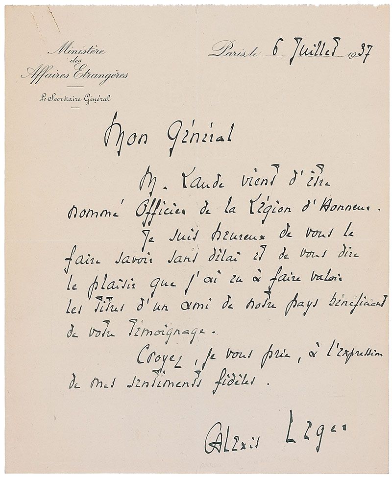 Pseudonym of Alexis Leger (1887–1975), French poet and diplomat who was awarded the 1960 Nobel Prize for Literature. ALS in French, signed “Alexis Leger,” one page, 8.25 x 10, Ministere des Affairs Etrangers letterhead, July 6, 1937. Letter to an unidentified general. In full (translated): “Mr. Laude has been awarded the dignity of officer of the Legion of Honour. I am happy to let you know this good news very quickly and to tell you my pleasure in having used your recommendation to give this mark of recognition to a good friend of France.” In fine condition, with central horizontal and vertical folds and a rusty paperclip mark to top edge. One of the most difficult to find Nobel winners, this is only the second Perse we have offered.