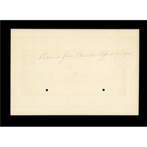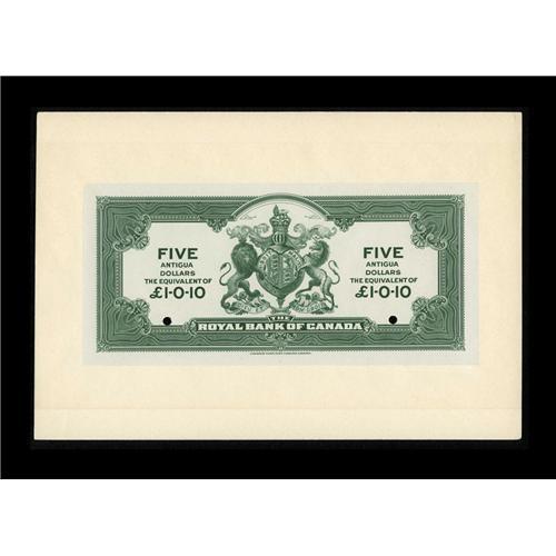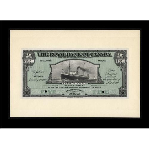 <B>St. John's, Antigua- Royal Bank of Canada</B></I> $5 Jan. 2, 1920 Ch. 630-24-02 Face and Back Proofs<BR>Both card stock mounted proofs have been punch cancelled twice. The back proof is unlisted in Charlton. The actual back proof has had its upper left-hand corner tip folded over and glued. <B>Choice Crisp Uncirculated</B></I> with "Received from Canada April 21/34" on the back plus other pencilled control markings.<BR><I>From The Halton Lake Collection</B></I>