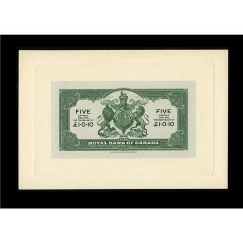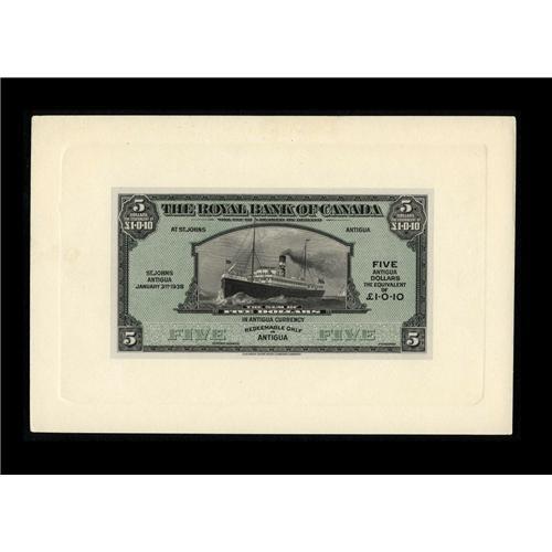 <B>St. John's, Antigua- Royal Bank of Canada</B></I> $5 Jan. 3, 1938 Ch. 630-26-02 Face and Back Proofs<BR>Both card stock mounted proofs have been shadow punch cancelled twice. The back proof is unlisted in Charlton. <B>Choice Crisp Uncirculated</B></I> with "Printed In Canada" stamped on the back in purple ink and "Canada #1931" plus other pencilled control markings.<BR><I>From The Halton Lake Collection</B></I>