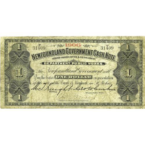 <B>St. John's NF- Newfoundland Government Cash Note</B></I> $1 1906 Ch. NF-5f<BR>An evenly circulated example of this uniface issue. <B>Fine.</B></I><BR><I>From The Halton Lake Collection</B></I>