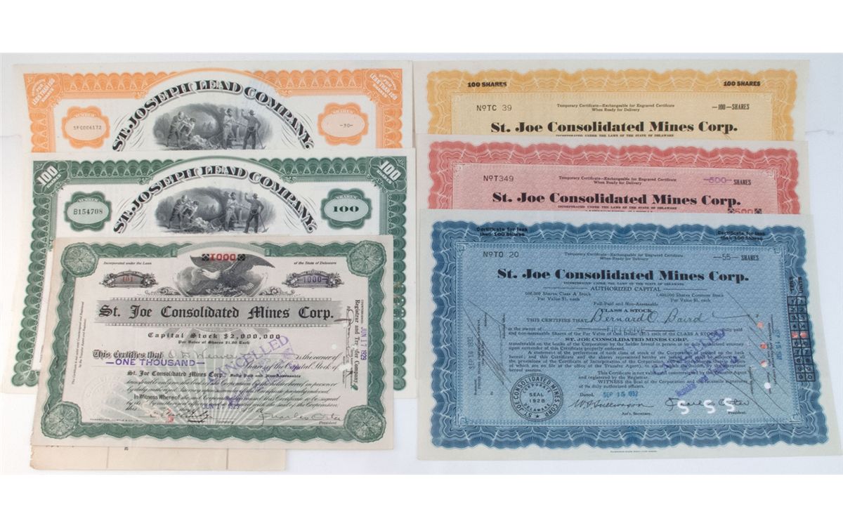 Lot of 6. 1) and 2) are from the St. Joseph Lead Company. Both are incorporated under the laws of the state of New York. Signed by vice president and secretary I. Broward Craig and president Lawrence Riggs. Measures 12 x 8. 1) Cert # B154708. Issued to Carson & Co. on May 8, 1969 for 100 shares. Cert # SF0006172 issued to E.F. Murdoch and Eleanor Murdoch on January 16, 1969. Little wear, folds. Not cancelled. 3) 4) and 5) are all from the St. Joe Consolidated Mines Corp. 12 x 8. Incorporated under the laws of the state of Delaware. All Cancelled. 3) Cert #. TO20 was issued to Bernard O. Baird on September 15, 1932 for 55 shares. 4) Cert #TC39 issued to Mary Lemon Darrow on December 22, 1931 for 100 shares. 5) issued Heald and Co. on June 6, 1934 for 500 shares. Some wear, cancellation marks. 6) St. Joe Consolidated Mines Corp. Cert # 401. Incorporated under the laws of the state of Delaware. Issued to O.W. Weaver on June 17, 1929 for 1000 shares. Signed by secretary (illegible) and president Charles Oster. Little wear, folds and cancellation marks. 10 ¼ x 6 ¾. Cancelled.