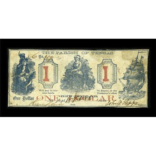 <B>St. Joseph, LA- Parish of Tensas </B></I>$1 March 18, 1862<BR> An unusual Parish where the higher denominations are considerably scarcer than the lower. A Very Good $1 from this Parish sold in 1991 for $200. Expect this <B>Fine-Very Fine</B></I> specimen with a couple of insignificant edge repairs to fetch somewhat more. <BR><I>From The Collection of a Louisiana Gentleman.</B></I><BR><BR><b>Shipping:</b> Coins & Currency (<a target="_blank" href="http://www.heritageauctions.com/common/shipping.php">view shipping information</a>)